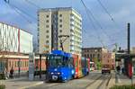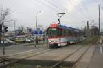 Cottbus: Straßenbahnlinie 3 nach Sandow an der Haltestelle Stadthalle.