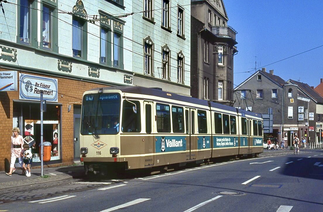Dortmund Tw 40 hat den Borsigplatz gequert und fährt via Oestermärsch in Richtung Innenstadt und weiter zur Schleife am WDR Funkhaus, 18.06.1988.