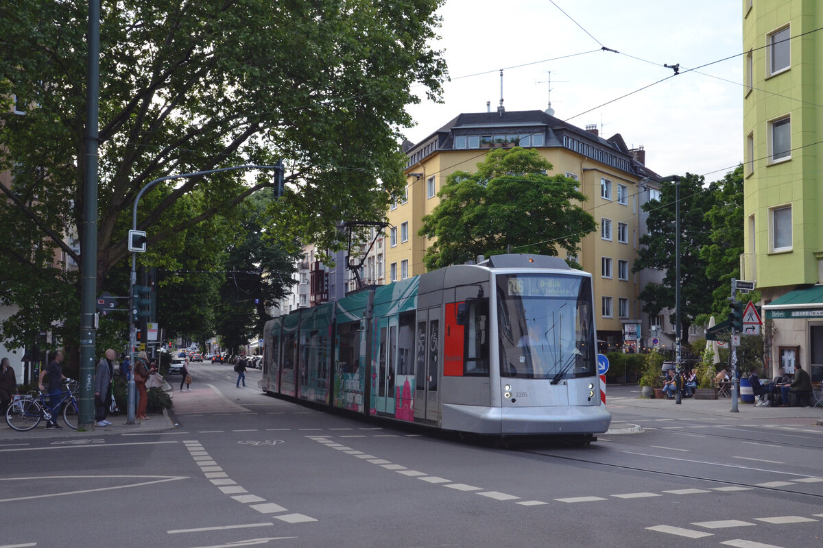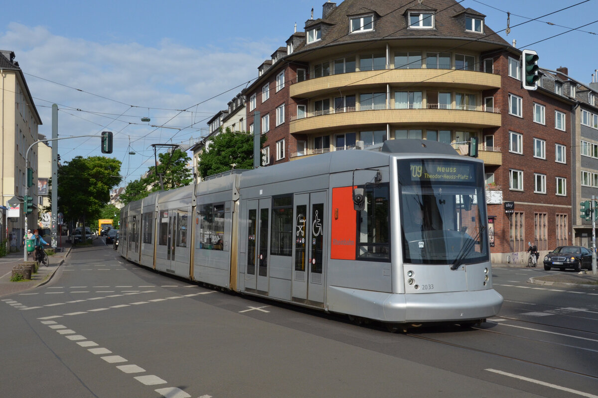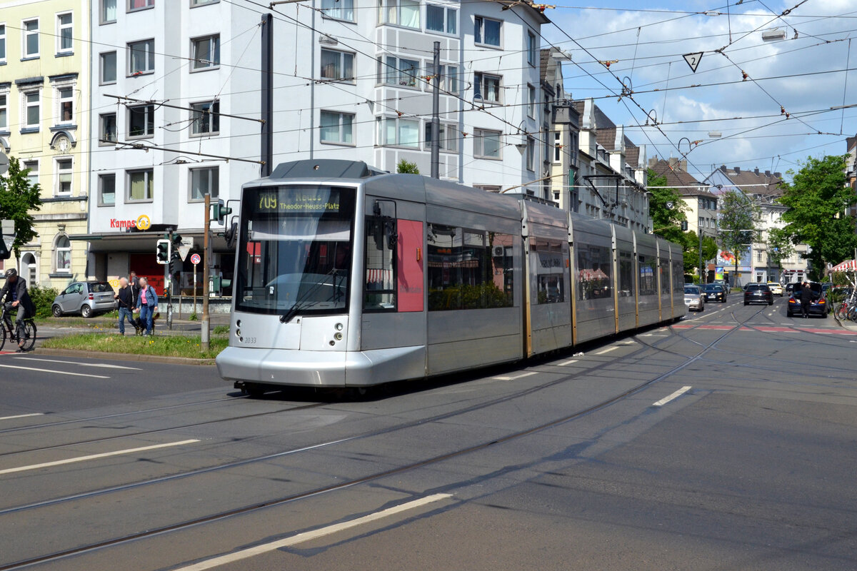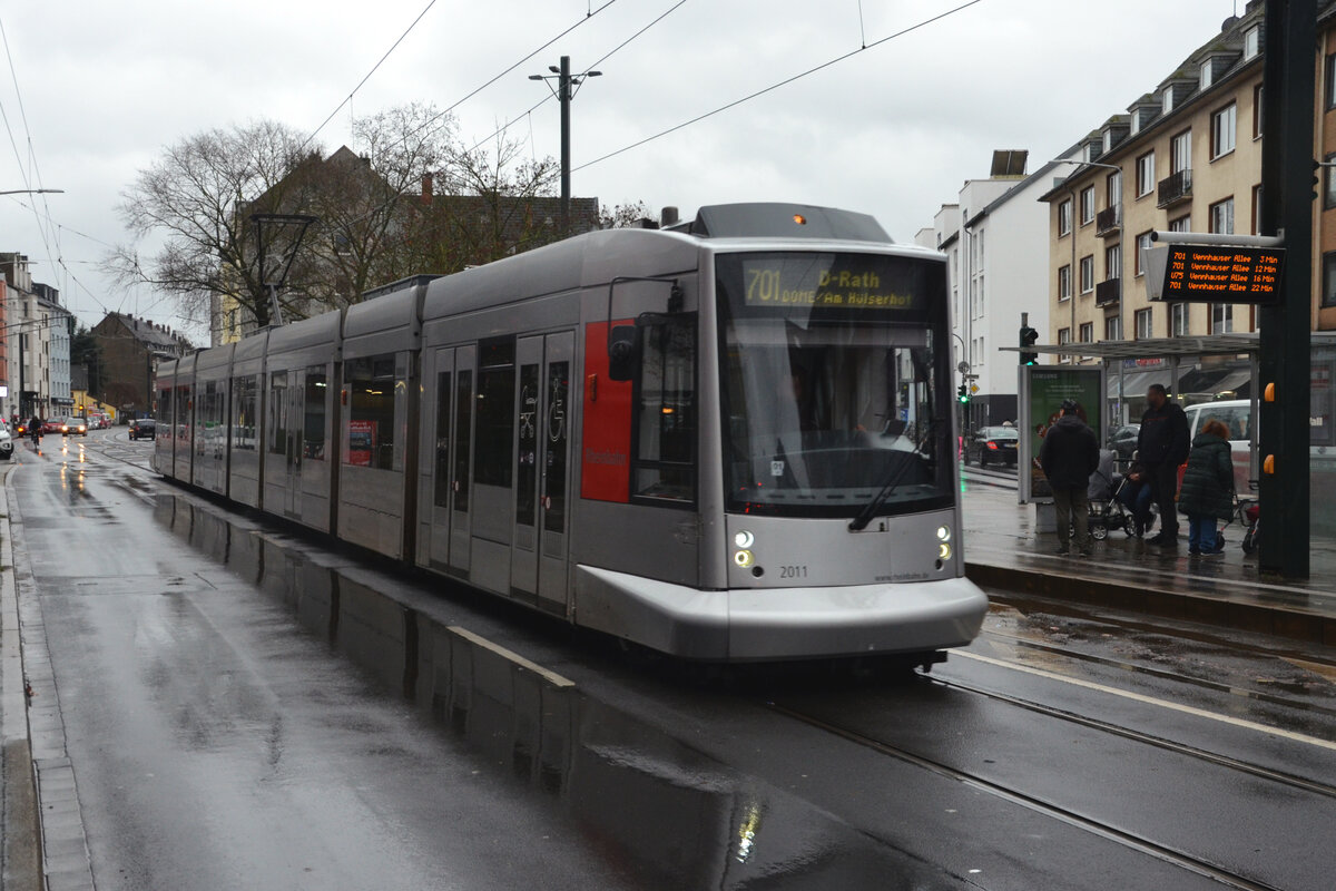Ein NF10 der Rheinbahn wendet am 14.12.2023 in der Schleife "Am Hülserhof" in Düsseldorf-Rath. Im Hintergrund das kürzlich geschlossene Vallourec-Stahlwerk (früher Mannesmann). Düsseldorf war ein wichtiger Standort der Stahlproduktion, mit Vallourec wurde nach jahrzehntelangem Niedergang das letzte Werk geschlossen.