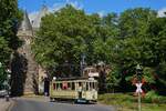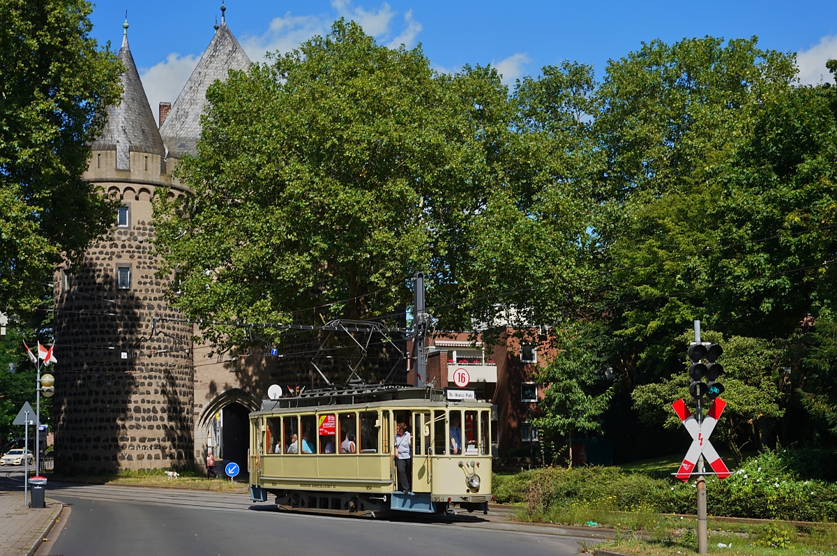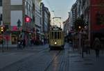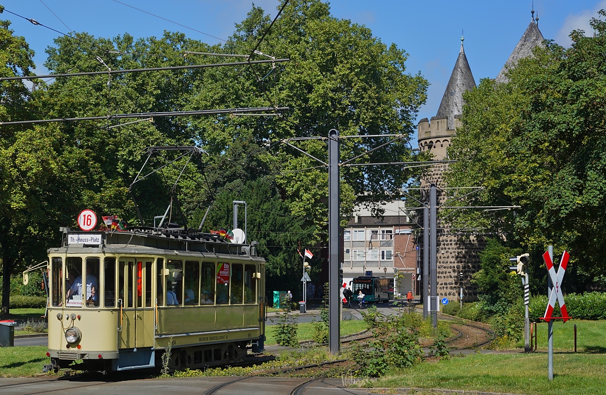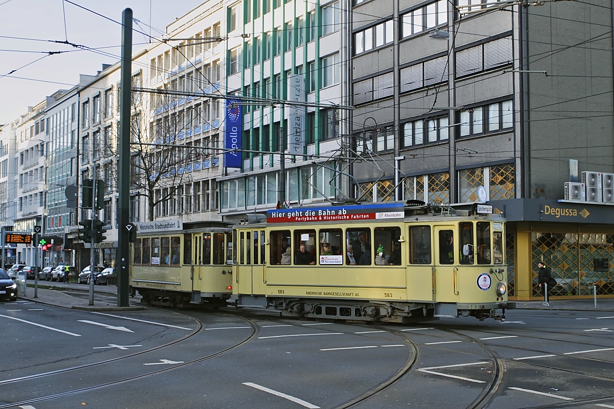 An der diesjährigen "Weihnachtswunder"-Aktion des Radiosenders WDR 2, bei der Spenden für wohltätige Zwecke gesammelt werden, beteiligten sich am 18.12.2023 auch die Rheinbahn und der Verein "Linie D". Insgesamt fünf historische Bahnen verkehrten an diesem Tag auf einen Rundkurs, der vom Spichernplatz im Statteil Derendorf zur Bilker Kirche führte. Interessierte konnten gegen eine Spende mitfahren. Eingesetzt wurden auch der inzwischen 102 Jahre alte Tw 583 mit dem nur unwesentlich jüngeren Bw 797 (Baujahr 1925), die hier von der Graf-Adolf-Straße auf die Berliner Allee einbiegen.