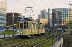 An der diesjährigen "Weihnachtswunder"-Aktion des Radiosenders WDR 2, bei der Spenden für wohltätige Zwecke gesammelt werden, beteiligten sich am 18.12.2023 auch die Rheinbahn und der Verein "Linie D". Insgesamt fünf historische Bahnen verkehrten an diesem Tag auf einen Rundkurs, der vom Spichernplatz im Statteil Derendorf zur Bilker Kirche führte. Interessierte konnten gegen eine Spende mitfahren. Tw 583 und Bw 797 sind hier zwischen den Haltestellen Schadowstraße und Sternstraße unterwegs. Die beiden 1921 bzw. 1925 gebauten Fahrzeuge scheinen nicht so ganz in das moderne Umfeld zu passen...