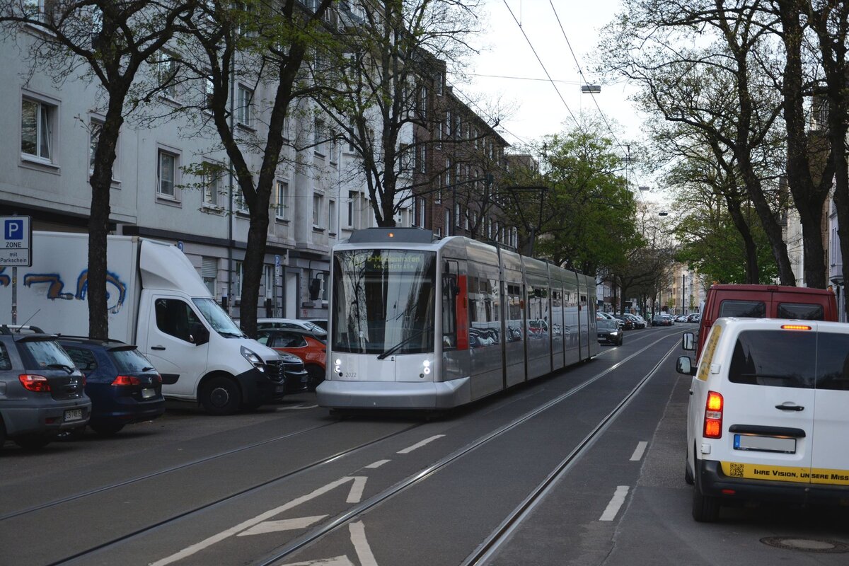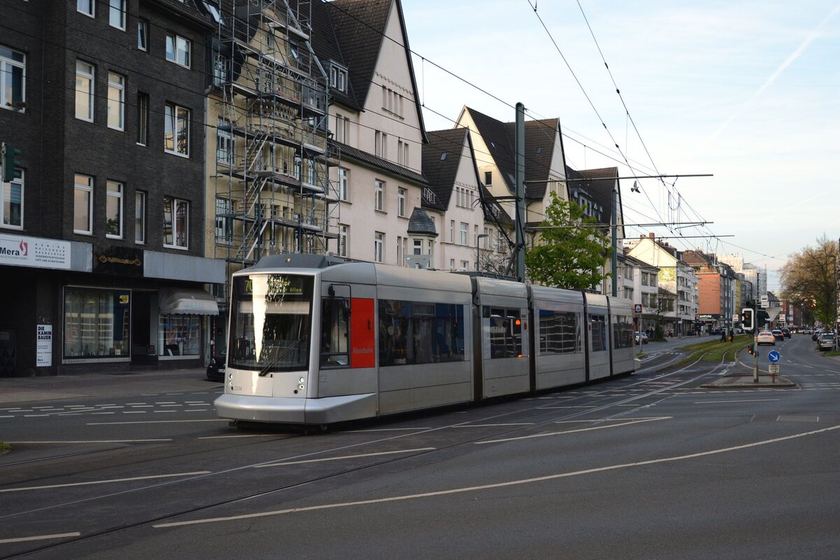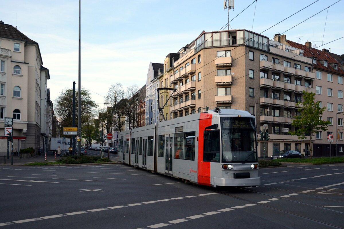 Der 1937 gebaute Rheinbahn-Niederflur-Tw 267 wendet um 2000 im Gleisdreieck in Düsseldorf-Hamm, im Hintergrund die S-Bahn-Station