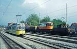 Schrott und Nicht-Schrott: Ein GT4 Zug der SSB fährt beim Möhringer Bahnhof neben den Beiwagen 1548 und 1551 (wer würde wohl der Nächste auf dem Schrottplatz sein, so war unsere Überlegung zu dieser Zeit) Datum unbekannt