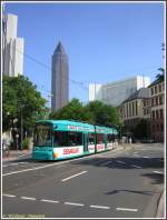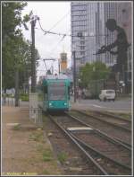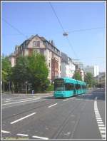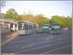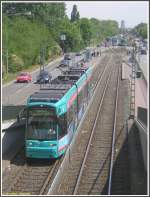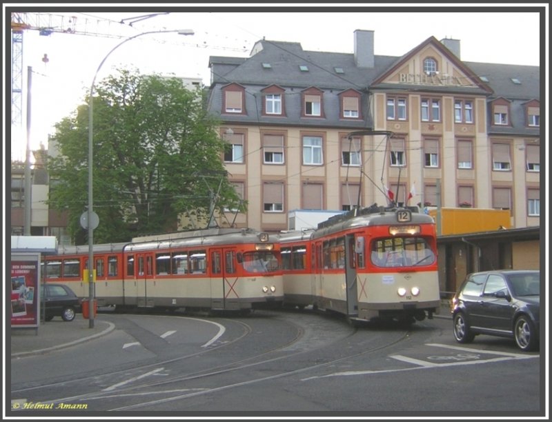 Abschiedsfahrt des Vereins Historische Straßenbahn der Stadt Frankfurt am Main für die Schleife am Prüfling am 17.06.2007 mit den Museumstriebwagen 102 der Bauart M (ex 602 Baujahr 1959 DÜWAG) und 112 der Bauart N (ex 812 Baujahr 1963 DÜWAG) in der Wendeschleife vor dem Bethanien-Krankenhaus. Der Bau einer neuen Tiefgarage für das Krankenhaus war mit ausschlaggebend für die Stillegung der Wendeschleife, wenn auch nicht die Hauptursache. Seit dem 17.06.2007 ist dieses Fotomotiv definitiv Geschichte.