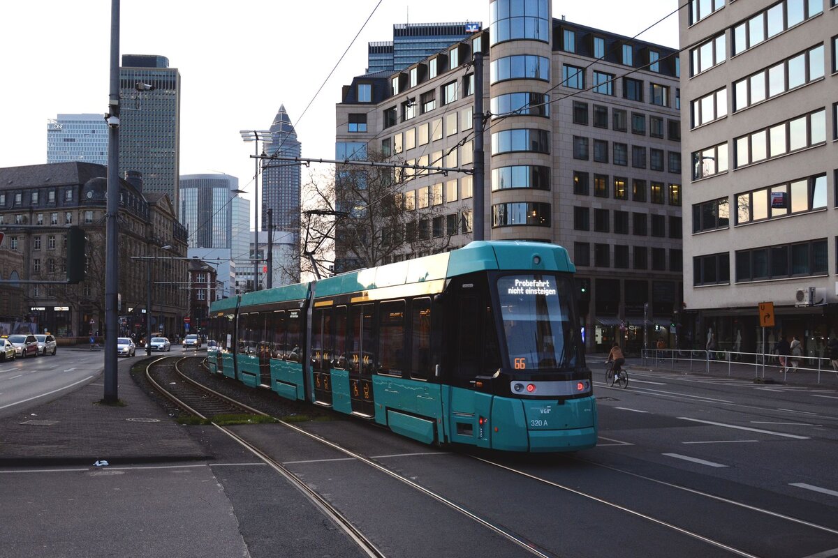 Im Hintergrund Frankfurts ältester regelmäßig verkehrender Straßenbahntyp.