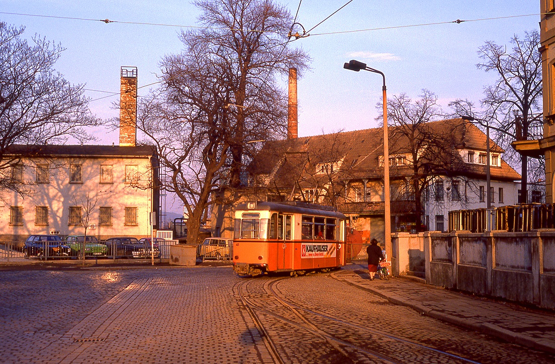 Die Gothaer Straßenbahn noch im DDR-Zustand. Am Hauptbahnhof, April 1990.