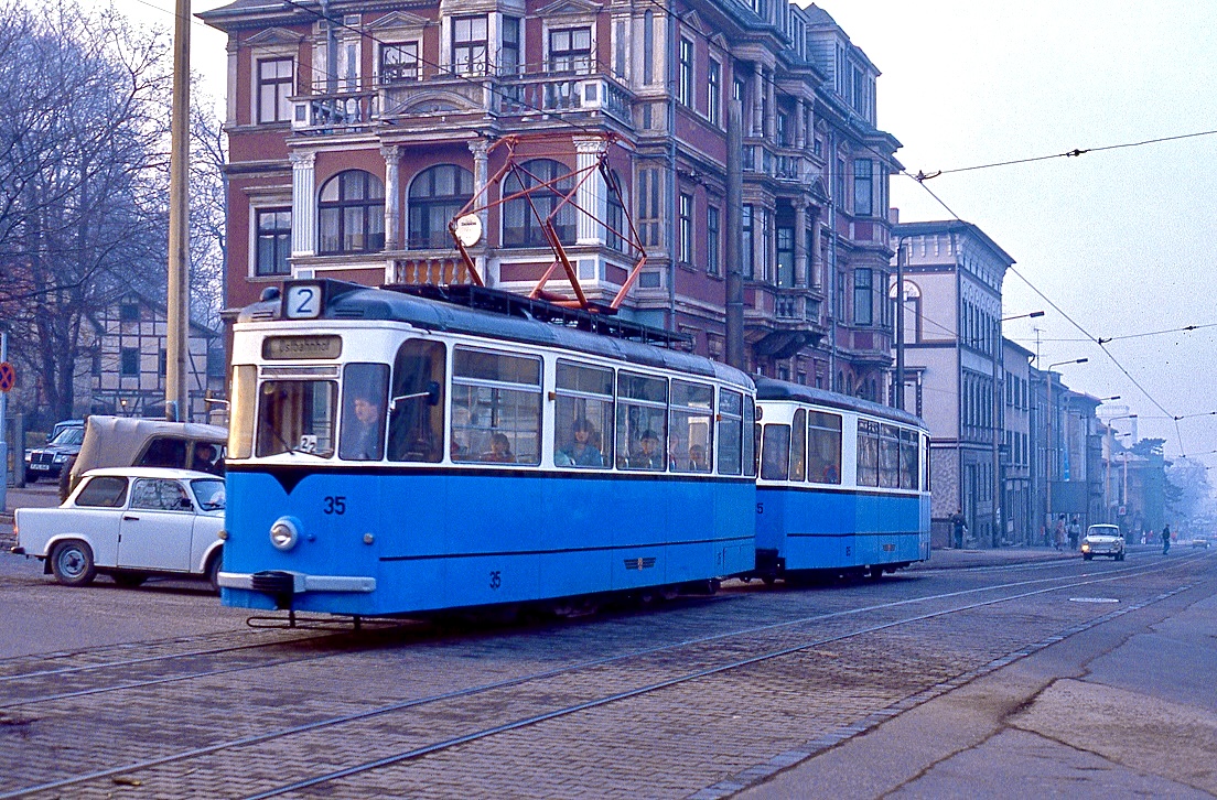Die Gothaer Straßenbahn noch im DDR-Zustand. Am Hauptbahnhof, April 1990. Die Gotha-Wagentypen kann ich nicht genau zuordnen.