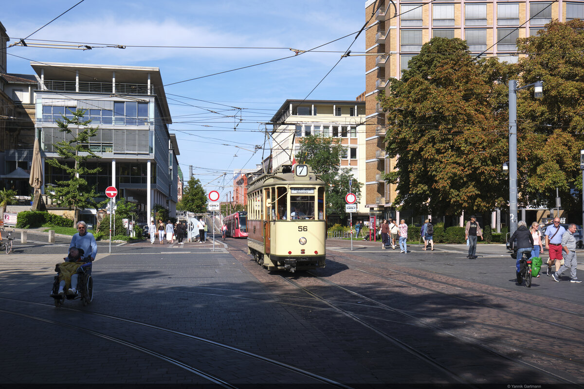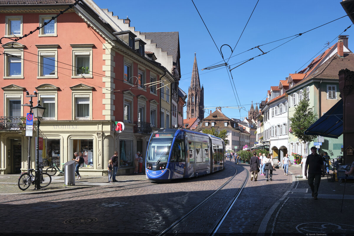 Detailansicht der Front einer Freiburger GT8Z-Straßenbahn an der Endhaltestelle Europaplatz der Linie 5.