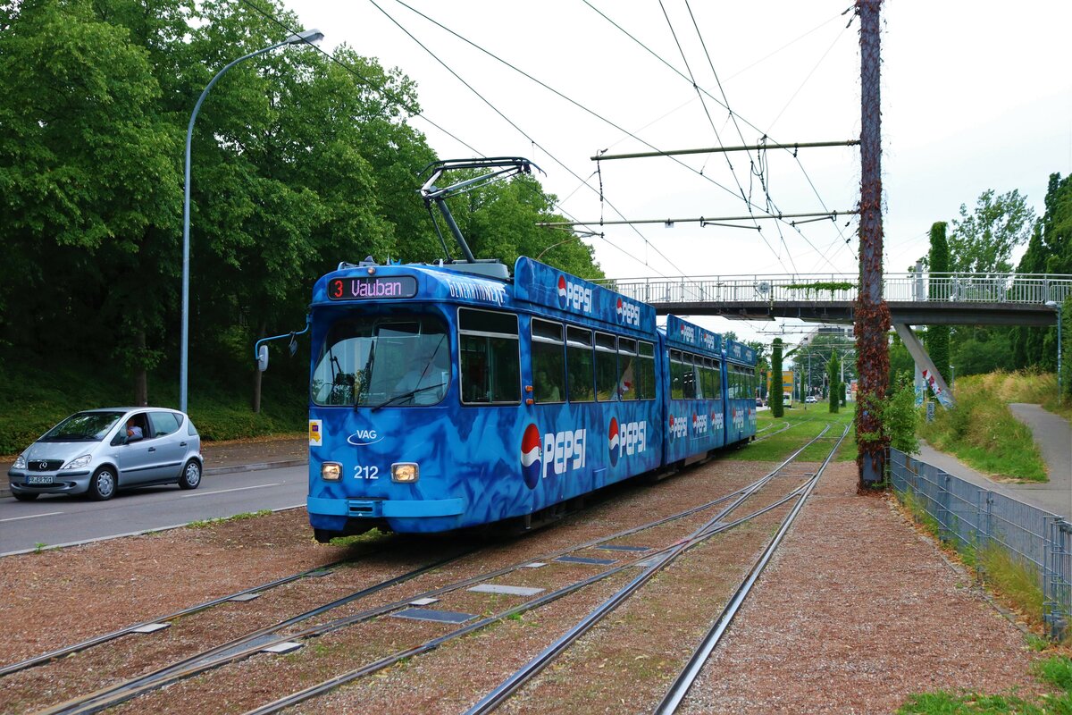 VAG Freiburg i.B. - Strassenbahn DUEWAG GT8K Nr.212 unterwegs auf Fahrschule in der Stadt Freiburg am 2024.07.05