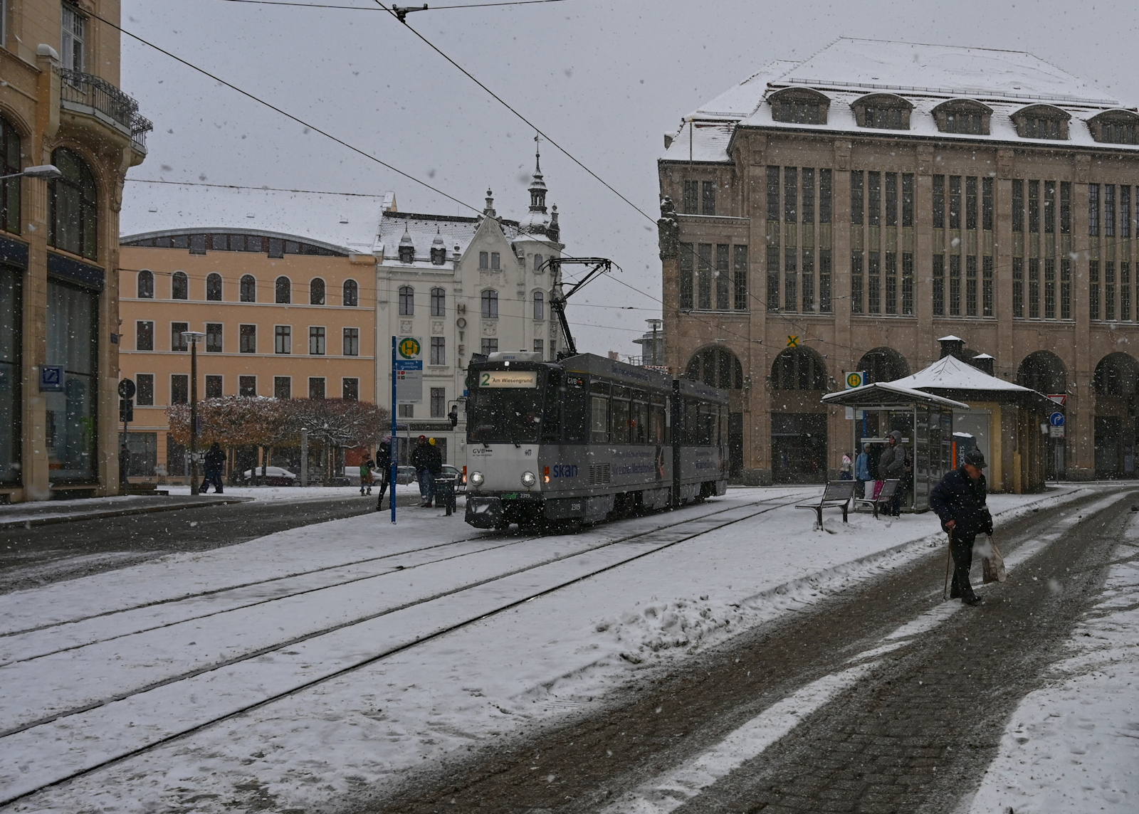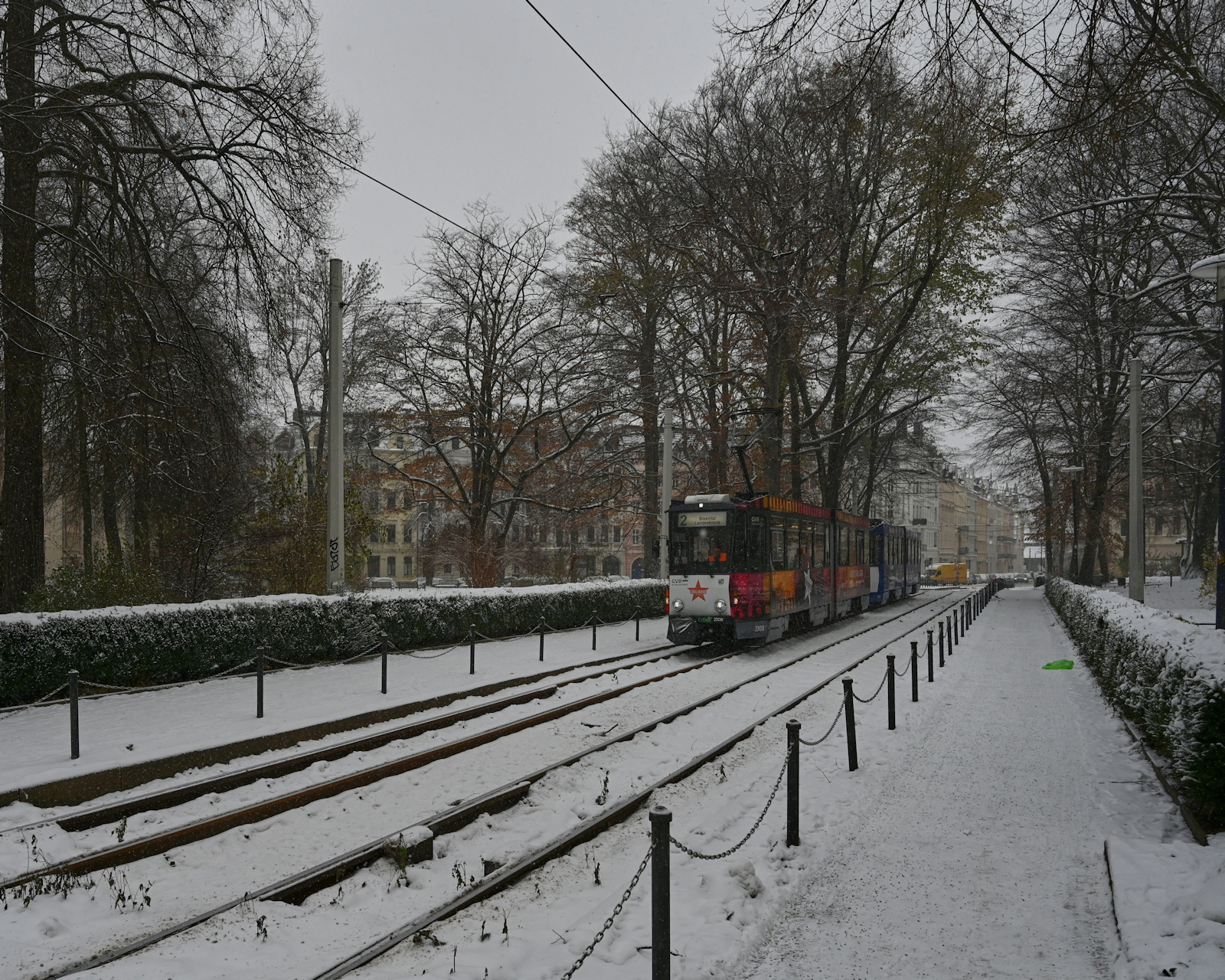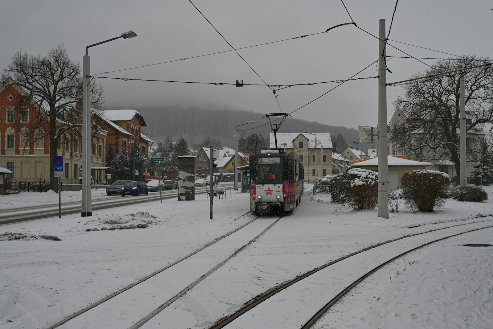 Über Schnee wurden sicher schon viele Filme gedreht. Hier ist aber der Görlitzer KT4D 2308 mit Görliwood-Werbung der Star im Schneegestöber, der am 02.12.2023 mit einem weiteren KT4D die Haltestelle Weinhübel Mitte erreichte.
