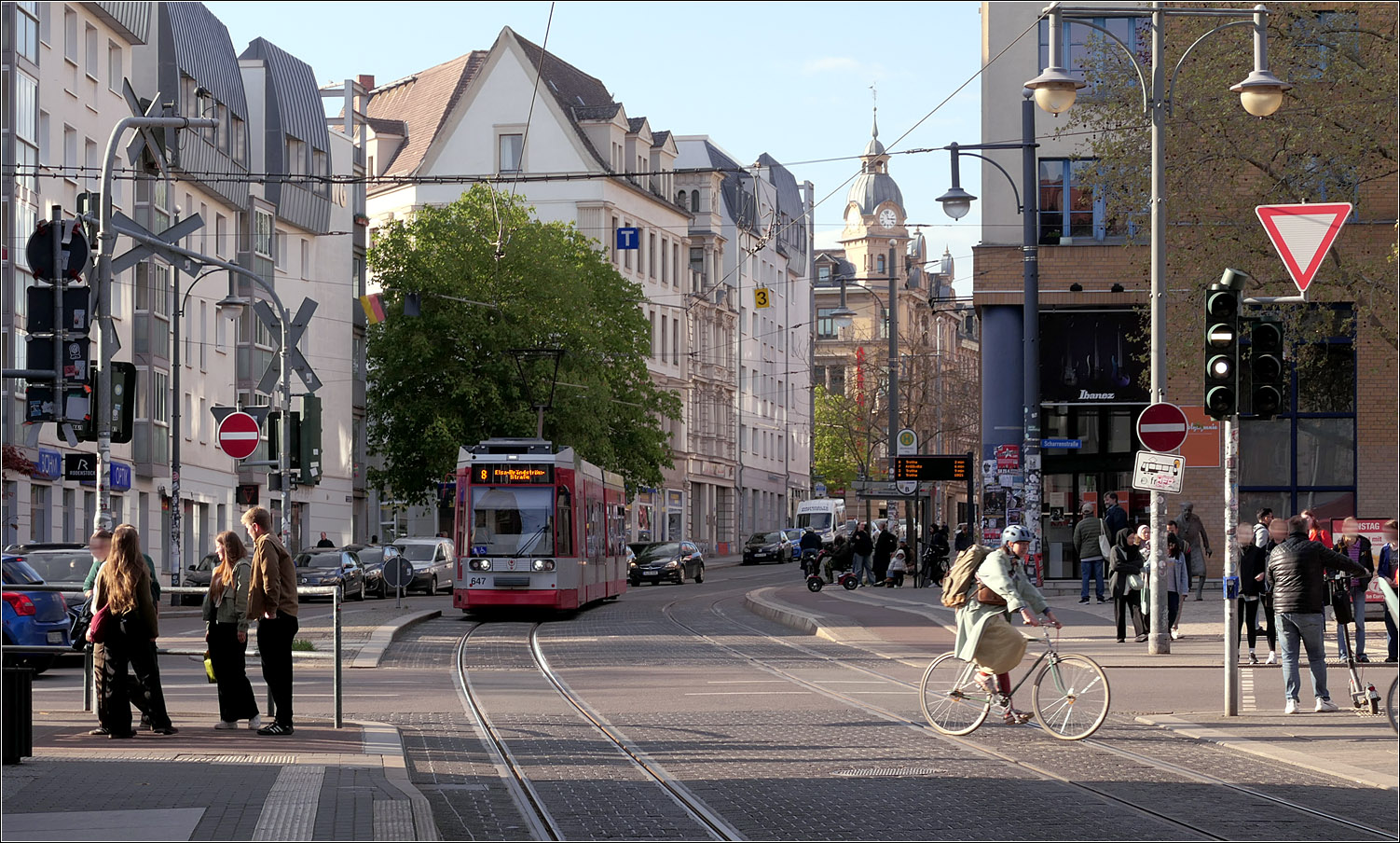 ... fahren über den Mittelpunkt der Stadt Halle, dem Marktplatz. Dort gibt es zwei Haltestellen, einmal in der Talamtstraße und direkt auf dem Marktplatz (Bild). Hier fährt Wagen Duewag Siemens MGT6D 626 der Linie 7 in die Haltestelle ein.