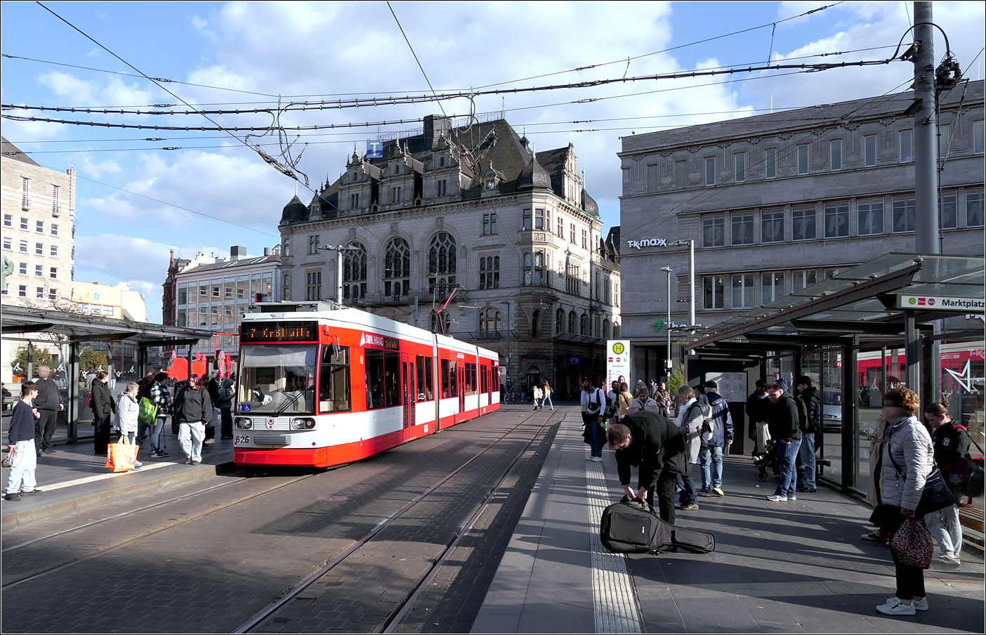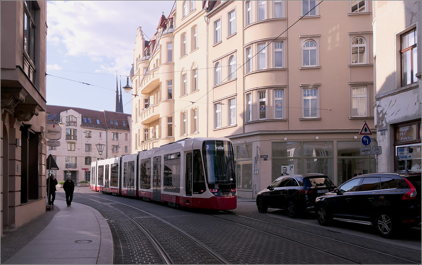 HAVAG 687 + 688 als Linie 5 nach Kröllwitz, am 04.12.2016 am Stadtpark in Merseburg.