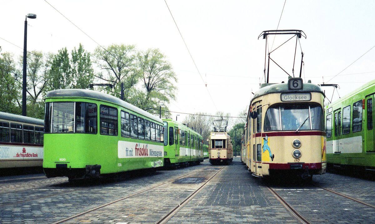 Besuch im Betriebshof Glocksee__Bw 1520 [DUEWAG/LHB 1962; +1994] und Tw 178 [HAWA 1928] und Breitraum-Tw 467 [DUEWAG 1956].__02-05-1989