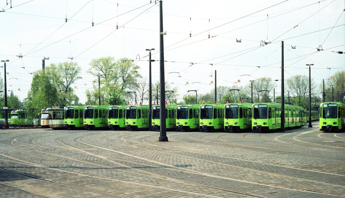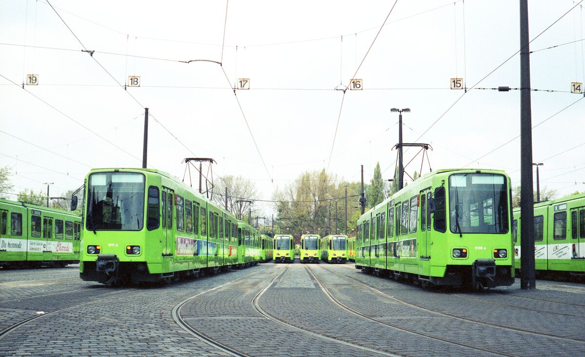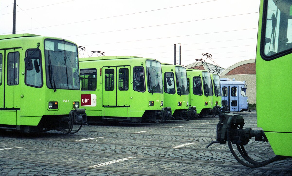 Besuch im Betriebshof Glocksee__"Alles im grünen Bereich..." Nur ein Breitraumwagen hat noch die frühere Farbgebung. Die Tw 6000-Flotte in lindgrün. Bei der ersten Lieferserie von 100 Stück kam der wagenbauliche Teil von der Düwag, von AEG, Kiepe und Siemens die elektrische Ausrüstung. Aus arbeitsmarktpolitischen Gründen erhielt LHB die nächsten Aufträge, um die Triebwagen in Niedersachsen bauen zu lassen. Von 1974 bis 1993 wurden 260 6000er geliefert. [Quelle: wikipedia]. __02-05-1989