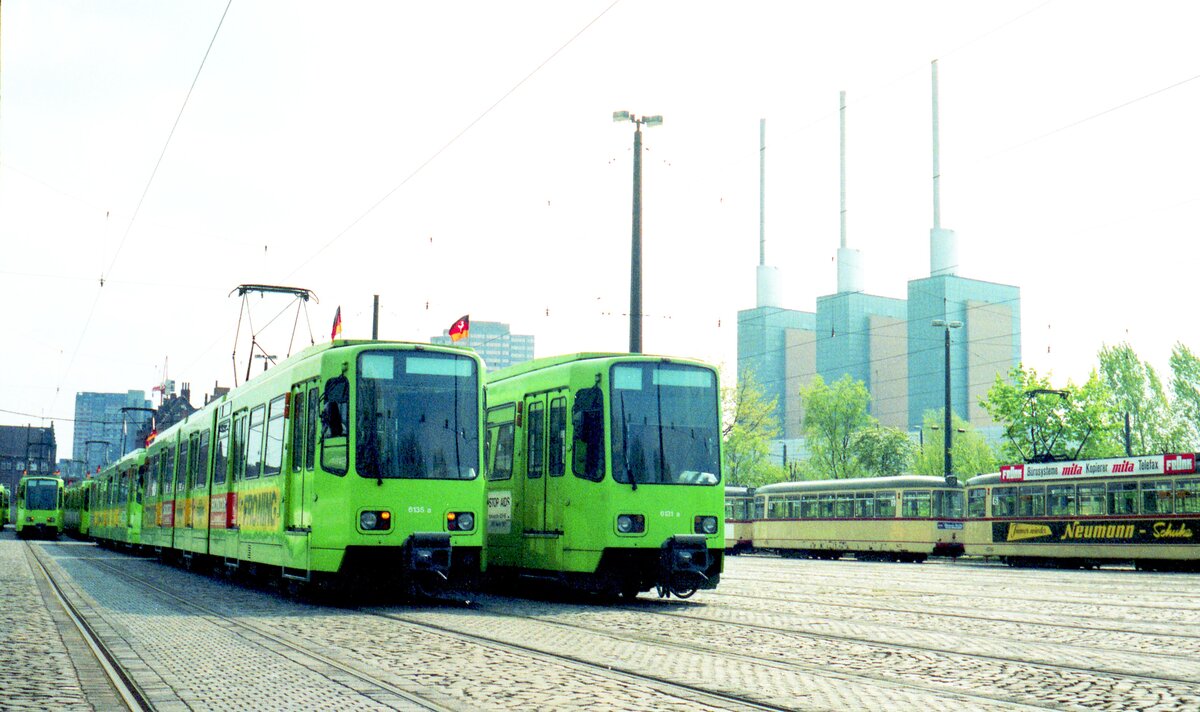 Besuch im Betriebshof Glocksee__Im Vordergrund die Tw 6131 und 6135 [beide LHB 1981;2019+]. Im Hintergrund, vor der Kulisse des Heizkraftwerks, einige DUEWAG B4 in klassischer Farbgebung.__02-05-1989