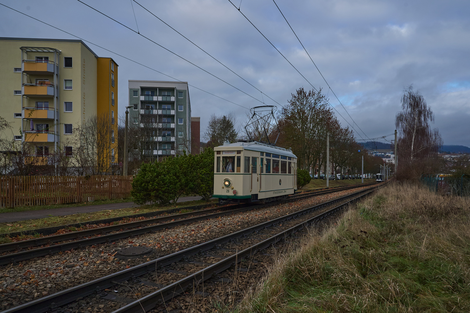 Wagen 26 der Jenaer Nahverkehr GmbH war am 29.11.2025 anlässlich einer Sonderfahrt unterwegs. Auf seiner Fahrt in Richtung Stadtzentrum kam der Wagen auch am ehemaligen Haltepunkt Jena Paradies vorbei. Michael Brunsch