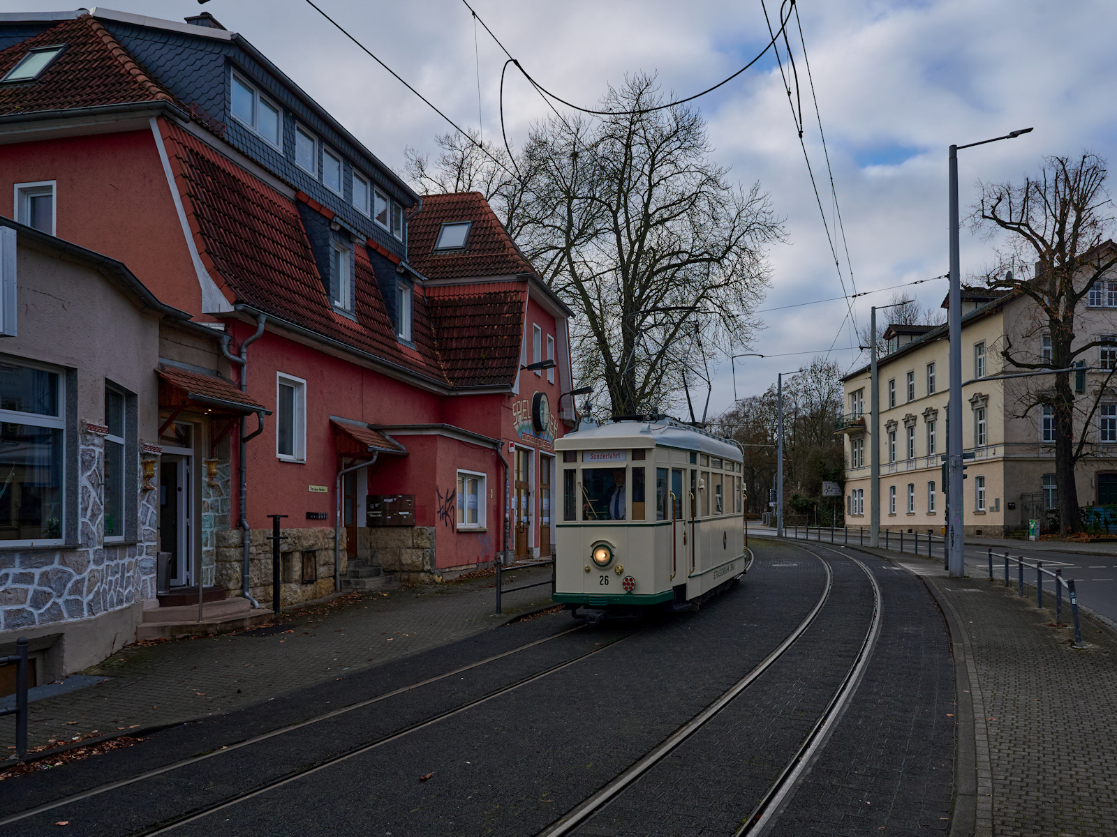 Auf einer Sonderfahrt kam der Jenaer Triebwagen 26 am 29.11.2025 an der ehemaligen Eisenbahner-Wohnanlage in der Dornburger Straße vorbei. Michael Brunsch