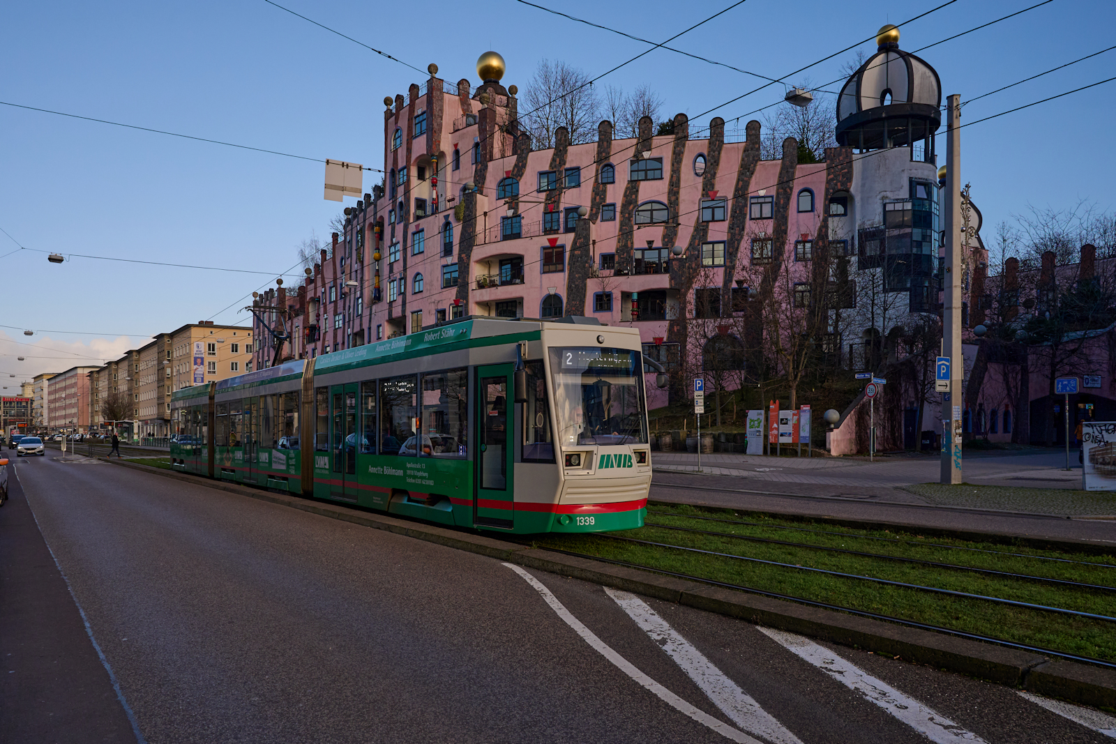 NGT8D 1339 der Magdeburger Verkehrsbetriebe fuhr am 20.12.2024 am als Linie 2 am Magdeburger Hundertwasserhaus vorbei in Richtung Westerhüsen.