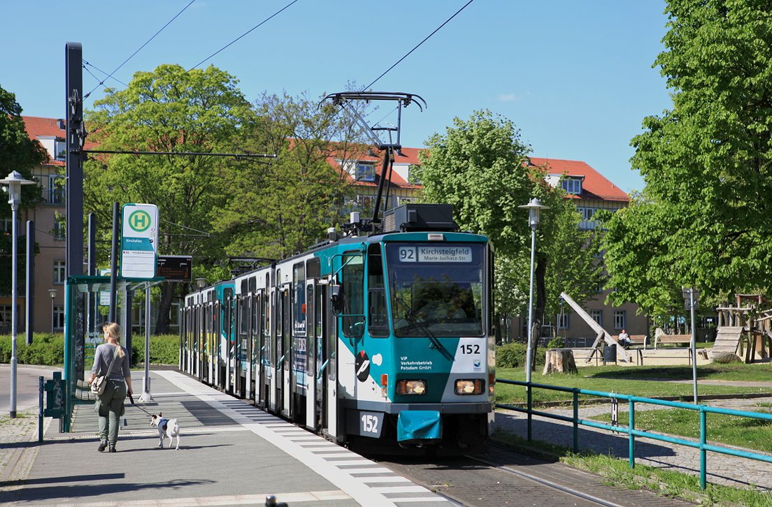 Am 06.10.2025 waren die Potsdamer KT4D 152 und 252 als Linie 96 auf dem Weg vom Campus Jungfernsee zur Marie-Juchacz-Straße. Nachdem die Haltestelle Alter Markt verlassen wurde, wird der Landtag passiert.