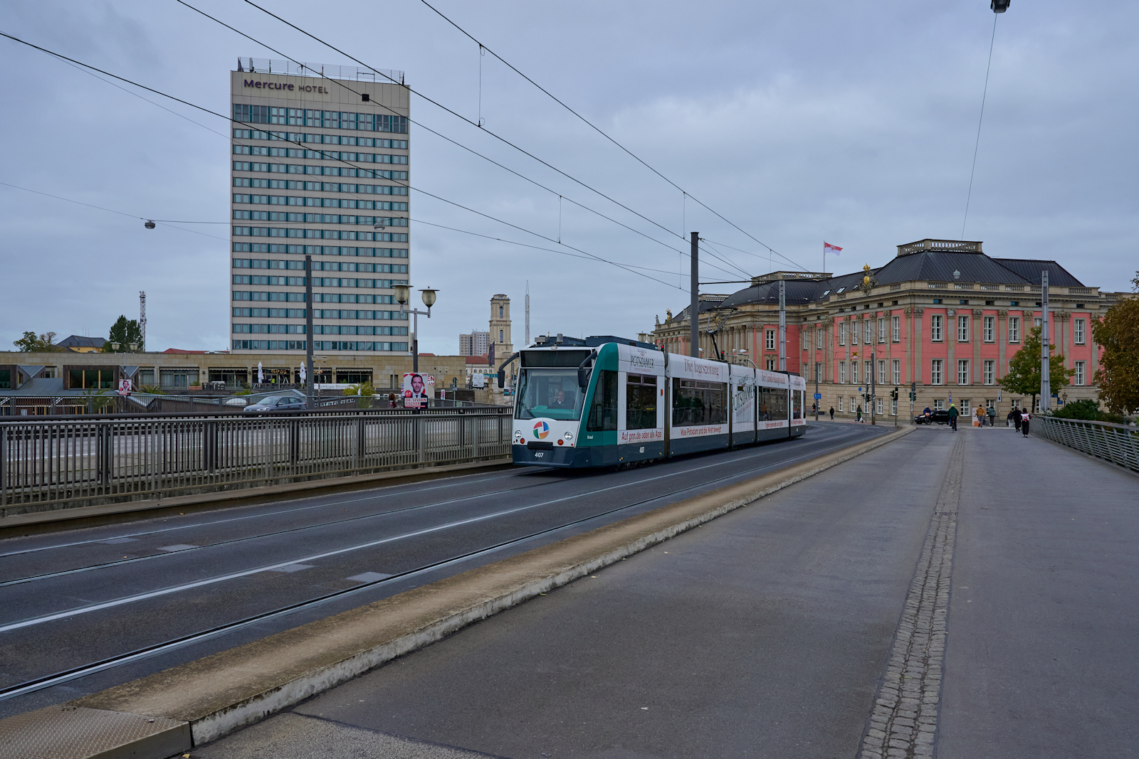 Siemens Combino 411 der Straßenbahn Potsdam kurz vor dem Nauener Tor, 11.08.2025