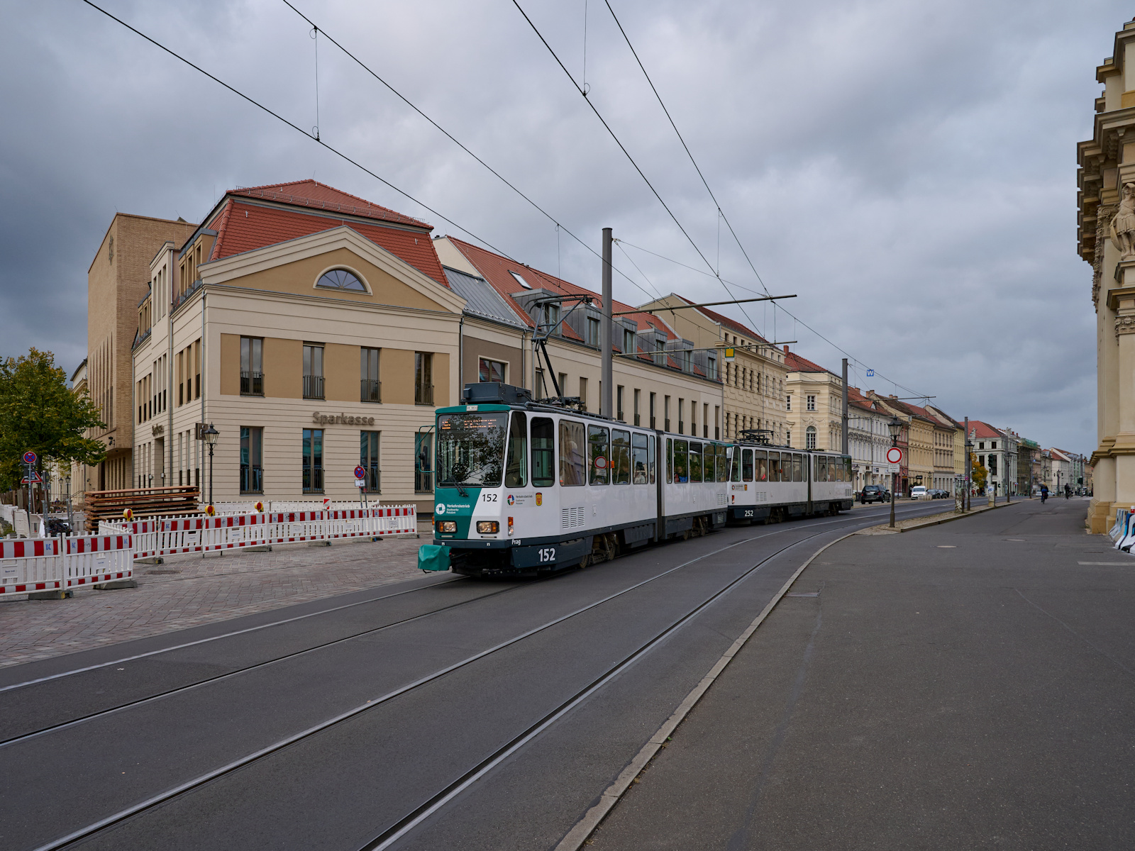 KT4Dm-Wagenzug 156+256 mit eingeschalteter Warnblinkanlage auf dem Weg zum Betriebshof. Eigentlich hätte dieses Fahrzeug ein Fahrt auf der Linie 99 übernehmen müssen, aber anscheinend hat es ein Defekt. Der Fahrer jedenfalls fuhr recht langsam. (Potsdam, 24.04.07)