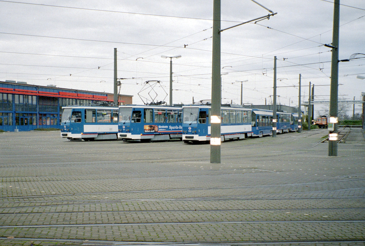 Rostock RSAG: Am Nachmittag des 25. November 2006 standen einige T6A2+4NBWE-Garnituren im Straßenbahnbetriebsbahnhof der RSAG in der Hamburger Straße. - Scan eines Farbnegativs. Film: Kodak FB 200-6. Kamera: Leica C2.