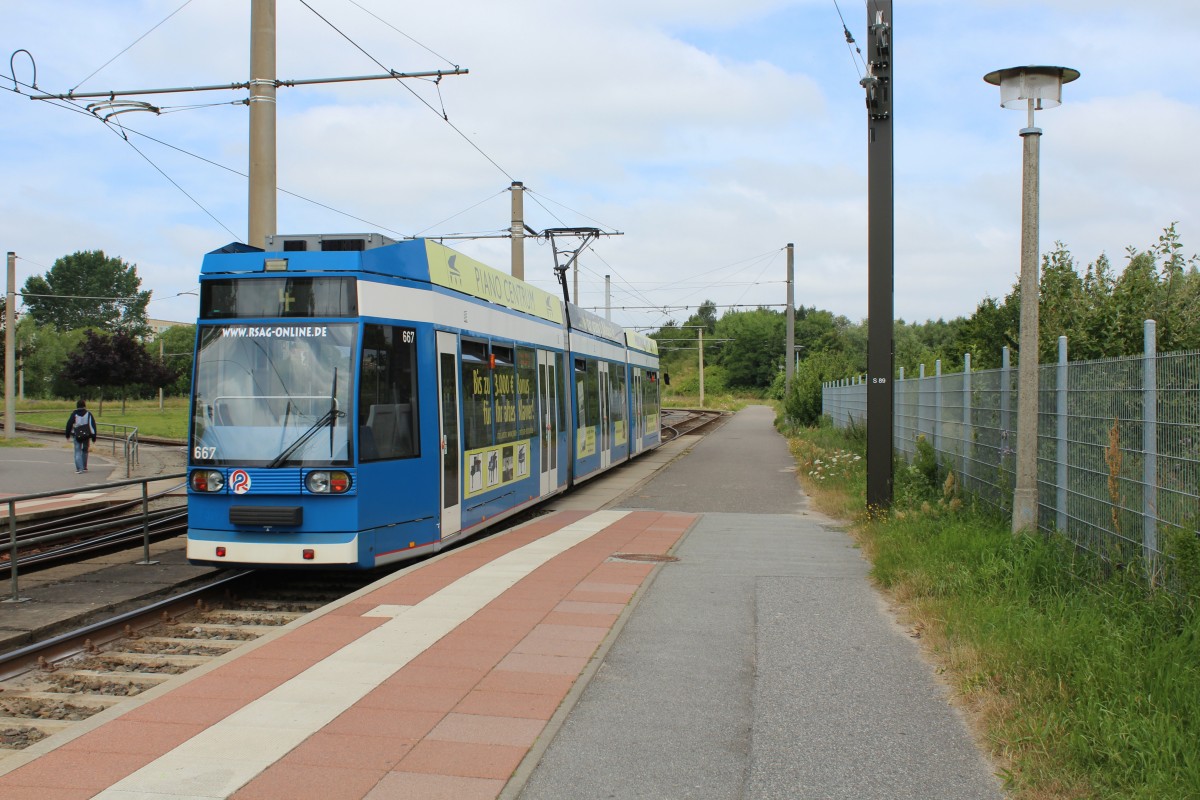 Rostock RSAG SL 4 (DÜWAG/DWA-6NGTWDE 667) Haltepunkt Dierkow am 19. Juli 2013.