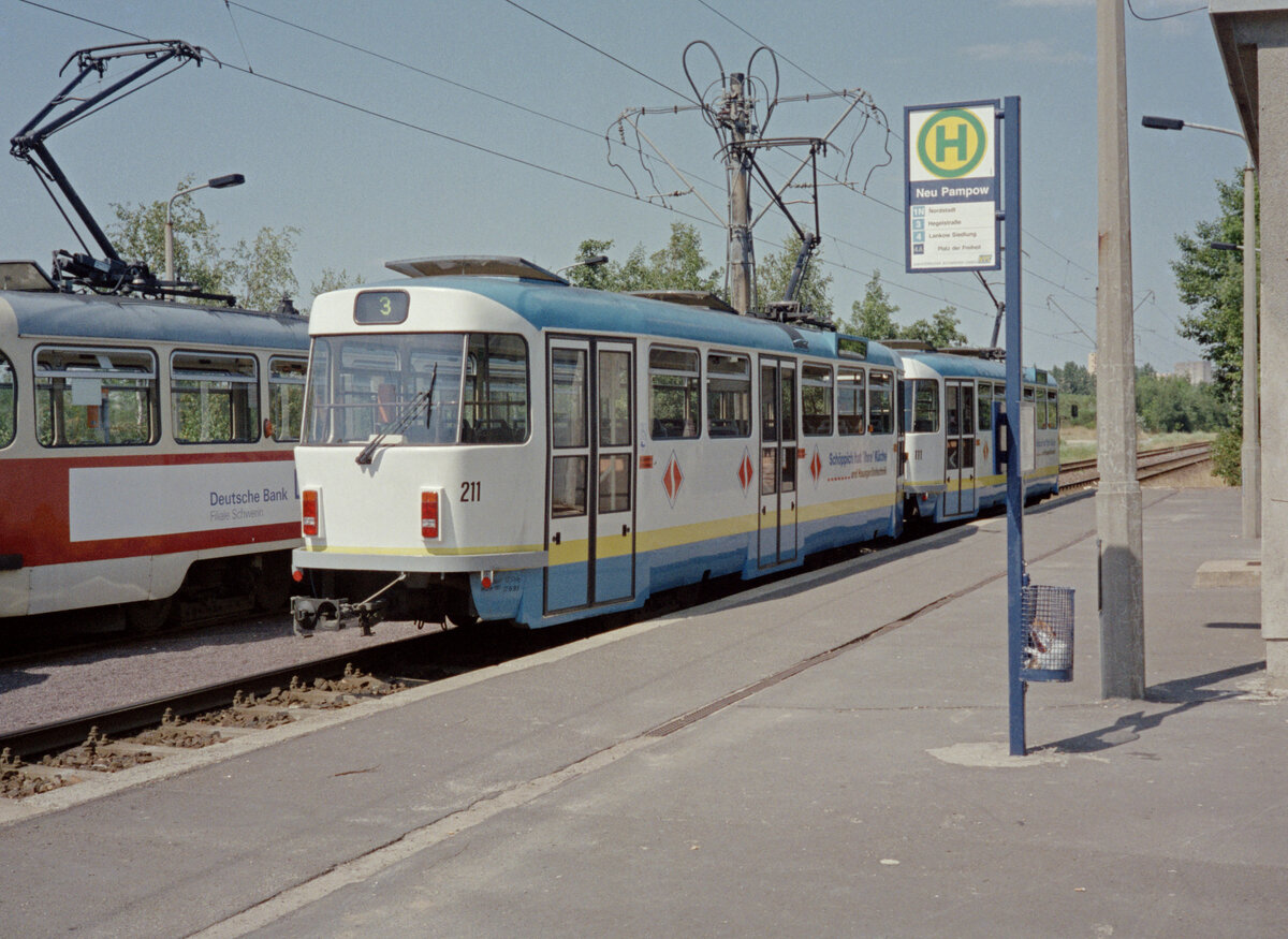 Schwerin NVS SL 3 (Tatra T3DC2 211 + TDC1 111) Neu Pampow am 12. Juli 1994. - Scan eines Farbnegativs. Film: Scotch. Kamera: Minolta XG-1.