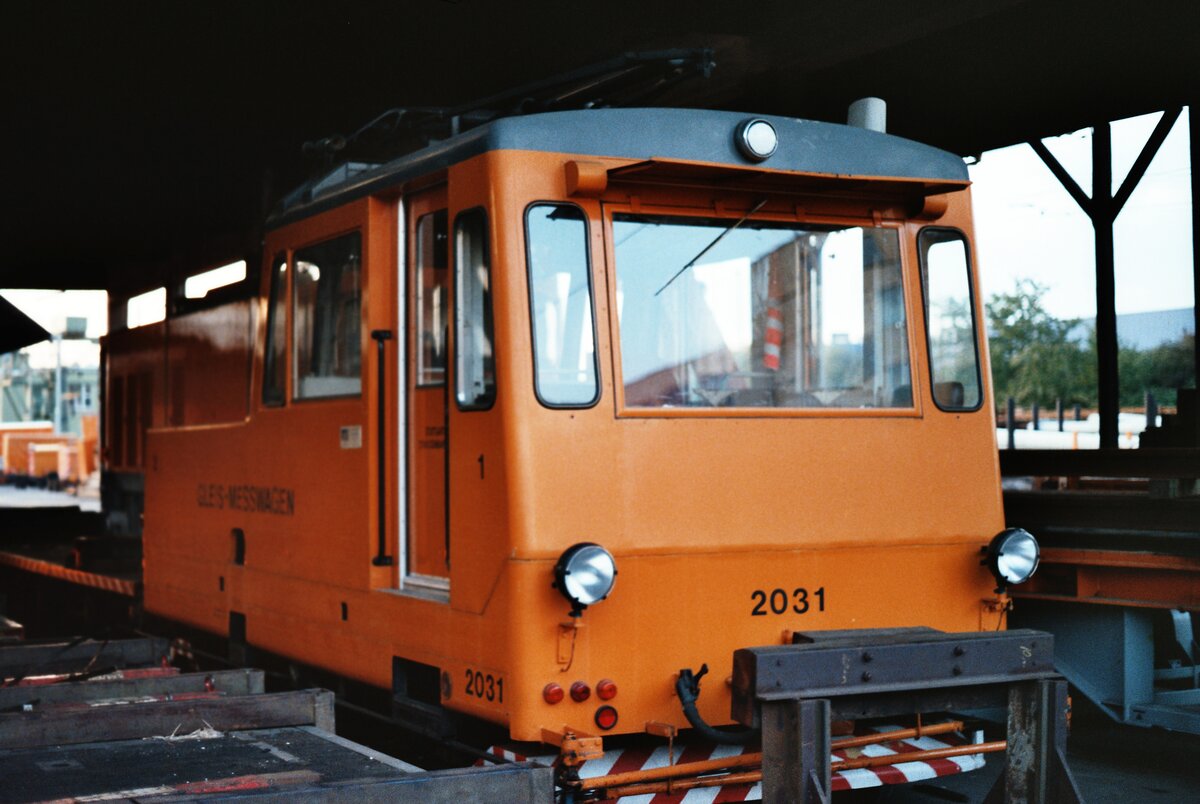 SSB Stuttgart__Arbeitsfahrzeuge der SSB in den 70er und 80er Jahren. Gleismeßwagen 2202 [HKE 1905 ex (Filderbahn/Württ.Nebenbahnen)WN 32; bei SSB 162. Hier bereits zur Rückverwandlung als Museumswagen, zusammen mit "seinem" Tw WN26 von 1912 -bereits im historischen grün-weißen Farbkleid- und weiteren als erhaltenswert abgestellten Fahrzeugen in der oberen Halle des Betriebshofs Ostheim.__05-1974