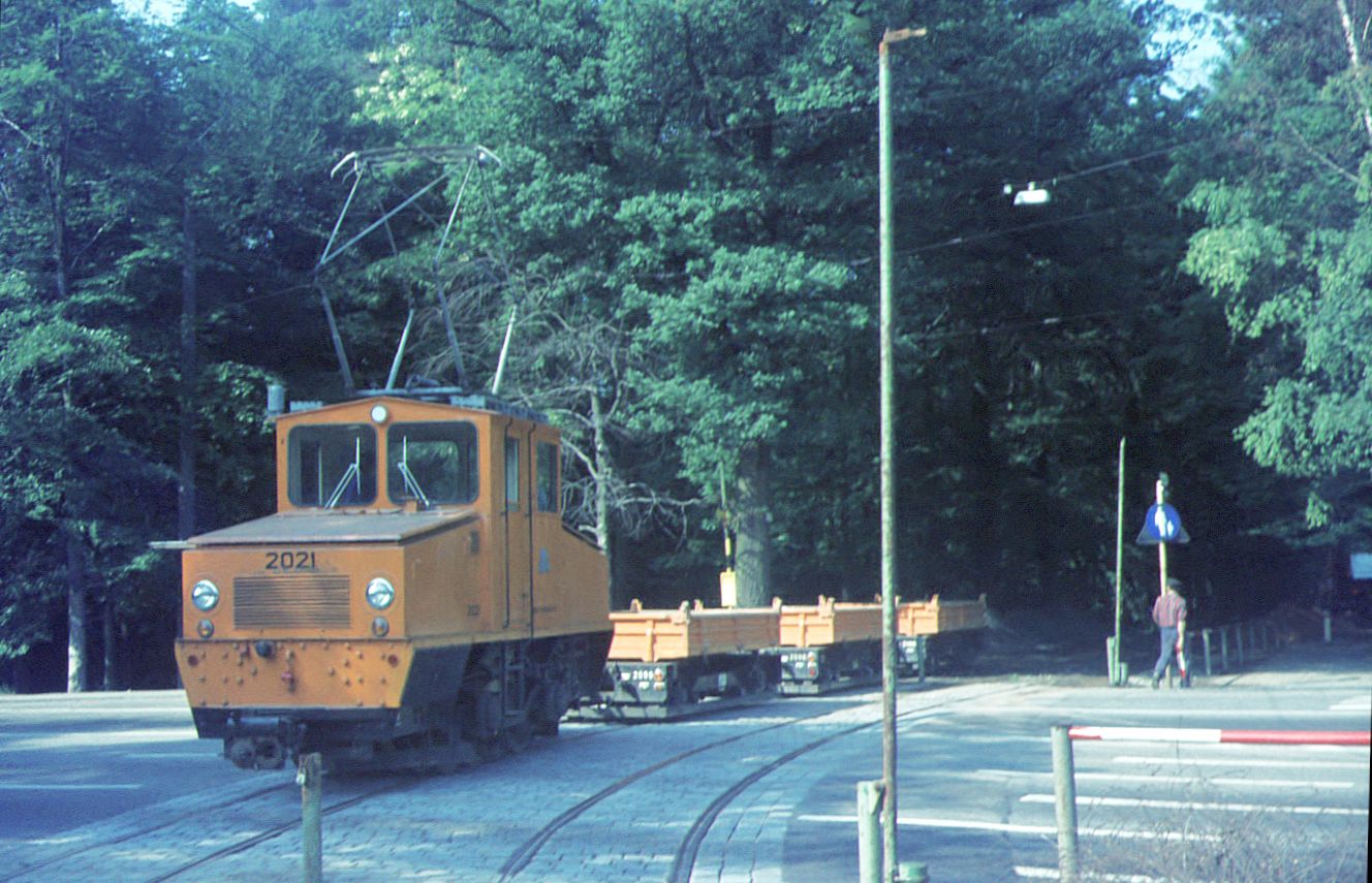 SSB Stuttgart__Arbeitsfahrzeuge der SSB in den 70er und 80er Jahren. A-Lok 2021 [ME/BBC 1946; +1995] mit drei Kipploren kommt bei der Haltestelle 'Ruhbank' (Fernsehturm) vom Georgiiweg auf dem Rest der zeitweiligen, eingleisigen Stichstrecke zu den Sportplätzen auf der Waldau. (Linie 'Sp' von 1932 bis 1939, Linie 9 von 1939 bis 1944. Während der Kriegsjahre diente die Linie hauptsächlich als Zubringer für die 'Schaffner-Maiden' von/zu ihrem Quartier im Straßenbahner-Waldheim.)__05-1971