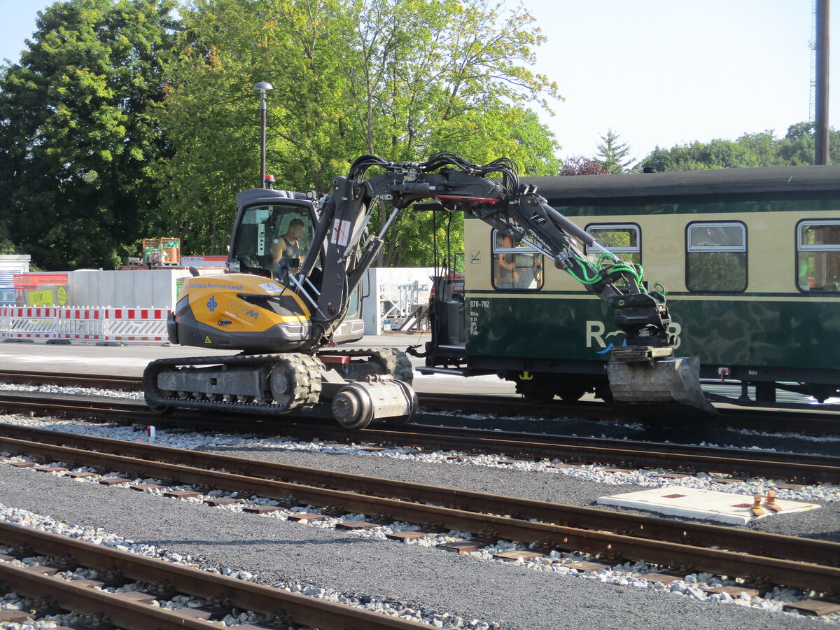 Ein Zweiwegebagger im Einsatz,beim Rasenden Roland,am 03.September 2024,in Putbus.