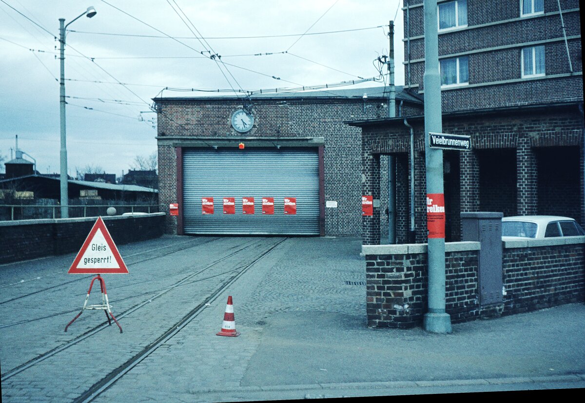 SSB Stuttgart__Zahnradbahn Tw 102 [ME 1935] auf einem der "Schrottgleise", daneben GT4 475 auf Linie 31 nach Vaihingen und das Ende eines 1500er-Bw (im doppelten Sinne).__03-1974