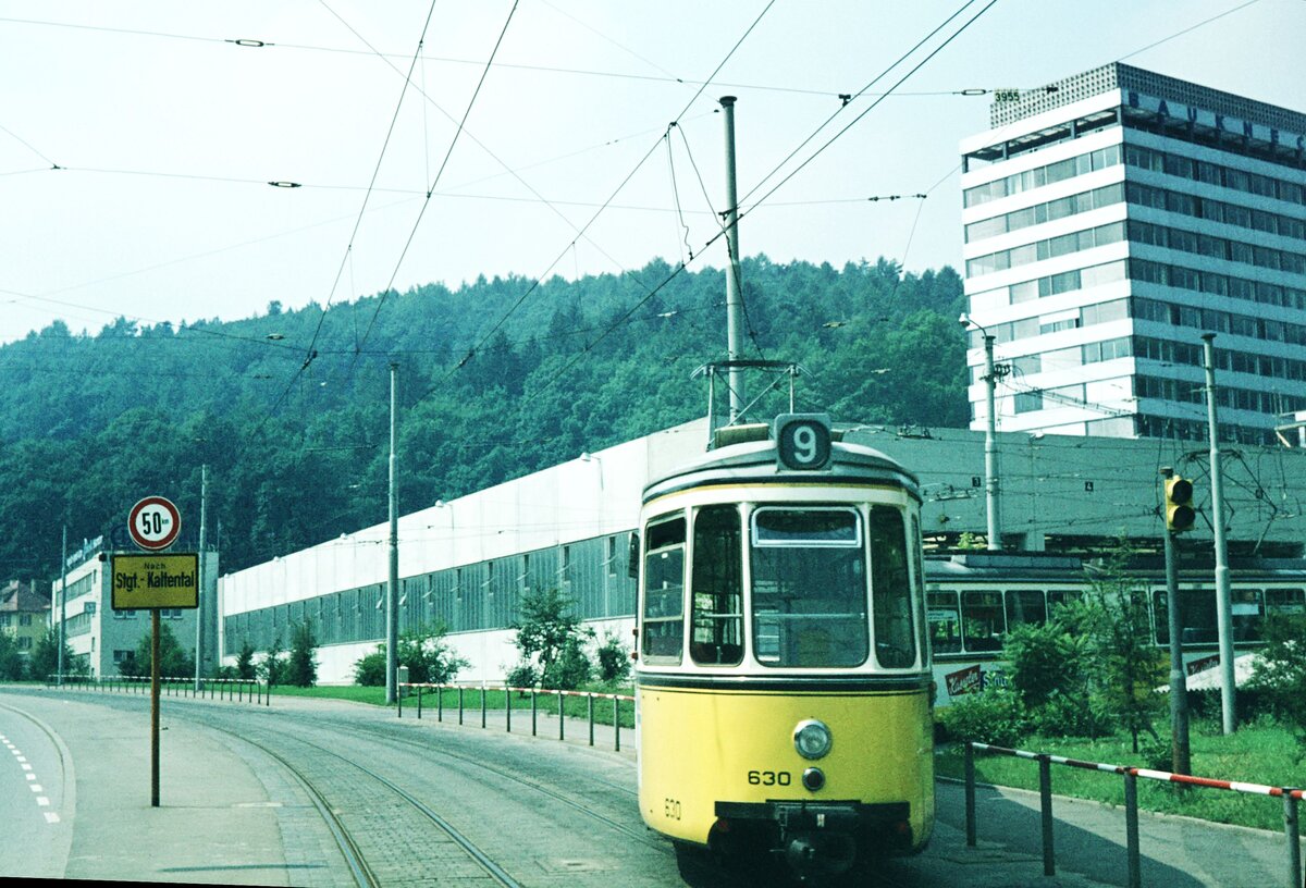 SSB Stuttgart__Liniennummern auf fremden Strecken. Umgeleiteter 9er mit BTw 630 macht die Kurve vor der Wagenhalle 'Heidenklinge'/'Vogelrain' in Heslach.__30-07-1973