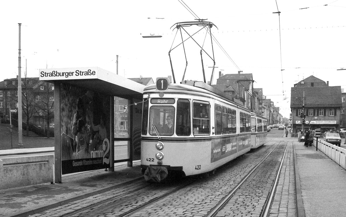 SSB Stuttgart__Liniennummern auf fremden Strecken. Linie 1 mit GT4 Nr.422 am Kelterplatz in Zuffenhausen fährt gleich in die Wendeschleife und zurück nach Rohr.__12-02-1977