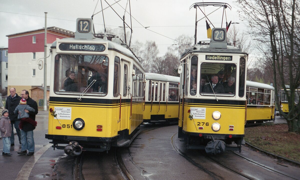 SSB Stuttgart__Umzug der SHB Museumswagen aus der Wagenhalle Zuffenhausen ins Straßenbahnmuseum Cannstatt. GS 851 und Tw 276 jeweils mit 1300er-Bw in der Endschleife Stammheim.__09-12-2007 Klaus-Erich Lisk