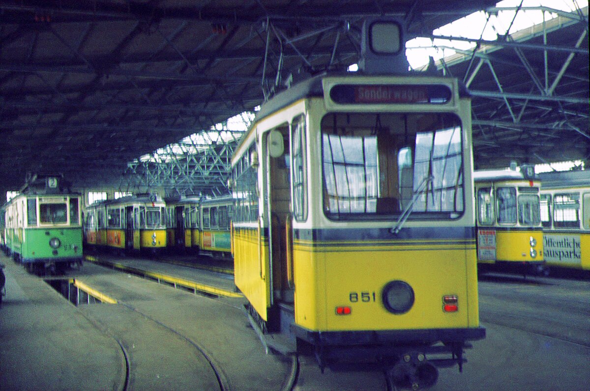 SSB Stuttgart_Straßenbahn-Betriebshöfe__Ostheim (Vh4)__Die alte obere Wagenhalle hat bereits die  Schwabengarage  belegt. Tw 851 auf Sonderfahrt an der Abfahrtstelle in der Wendeschleife.__19-05-1973