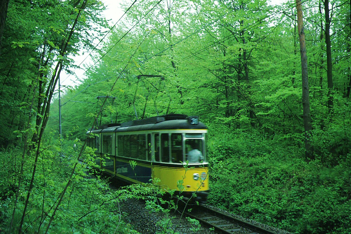 SSB Stuttgart_DoT4 auf nicht alltäglichen Routen. Nicht ganz scharf, aber selten ! DoT4 - mit zwei Strombügeln- auf Linie 31, im Landhauswald zwischen Haltestelle 'Landhaus' und 'Beiberg' vor Plieningen.__10-05-1974