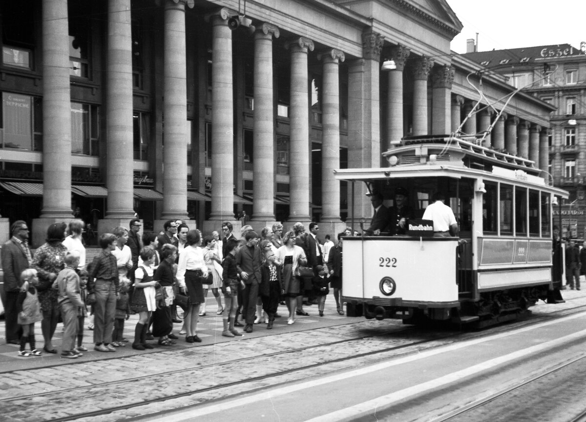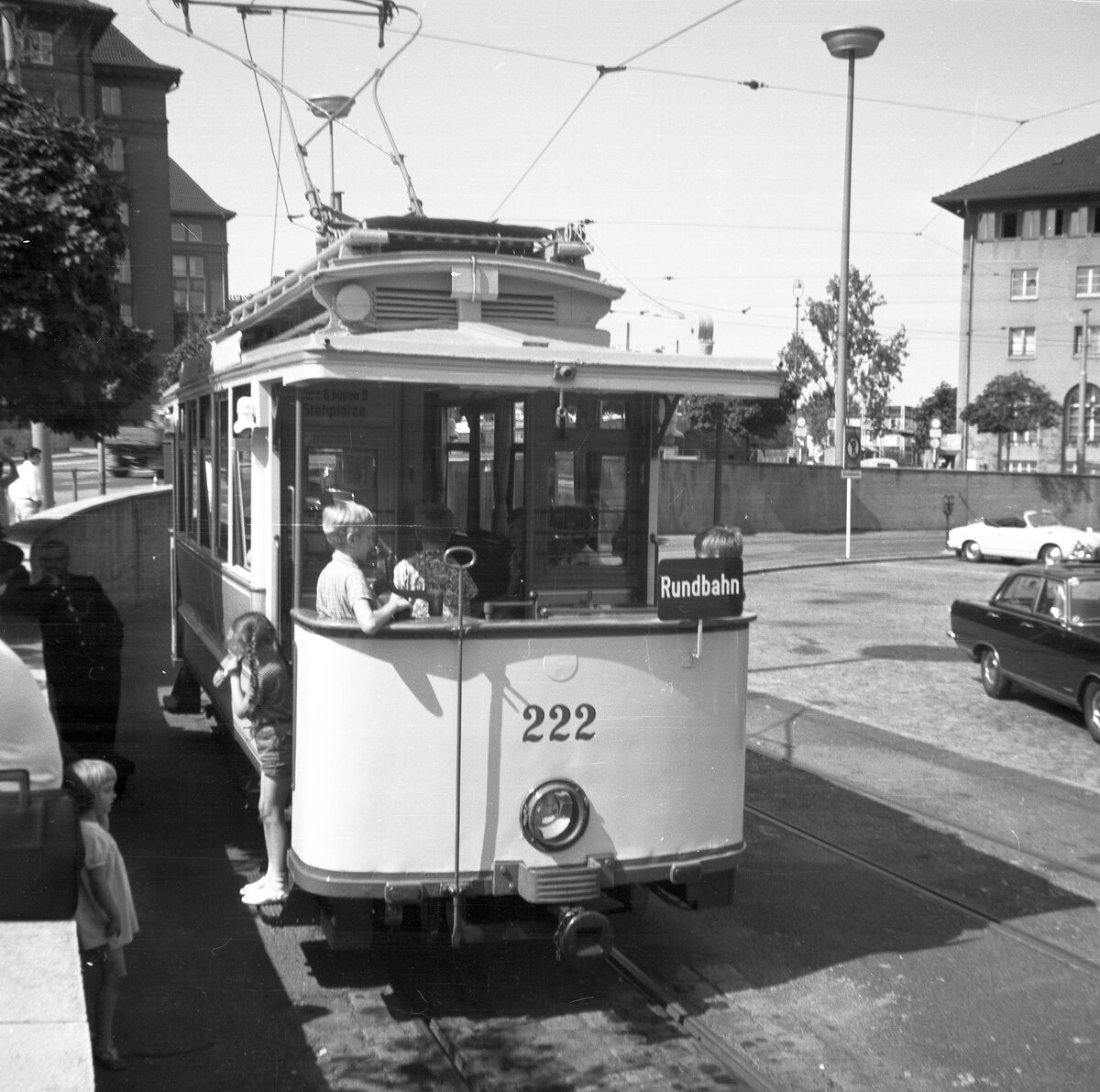 SSB Stuttgart__Den Tw 222 von 1904, zuletzt als Salzwagen 2016 im Dienst, ließen die SSB zum ersten "offiziellen" historischen Fahrzeug herrichten. Von einem möglichen Museum wurde seinerzeit höchstens hinter vorgehaltner Hand gesprochen. Im Juli 1968 fuhr Tw 222 ungefähr die Strecke der ersten Pferdebahn von 1868 vom Schloßplatz über (nein bereits unterm) Charlottenplatz, die Neckarstraße hinunter bis Stuttgart Berg.__07-1968 Klaus-Erich Lisk