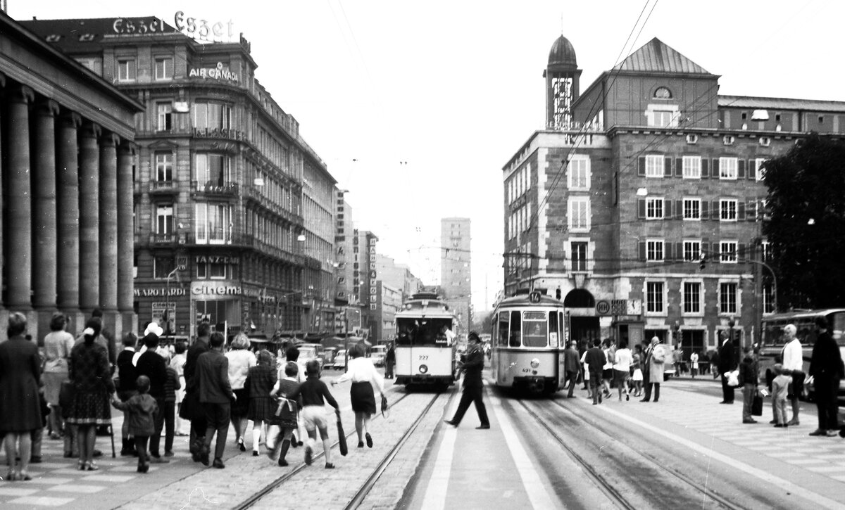 SSB Stuttgart__"Der Jubiläumswagen kommt!". Ansturm am Schloßplatz auf den Tw 222 von 1904, der im Juli 1968 zum 100jährigen Jubiläum der Straßenbahn in Stuttgart seine Runden drehte.__07-1968 Klaus-Erich Lisk