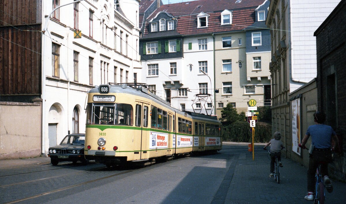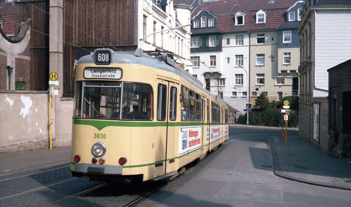 Spurensuche bei der Wuppertaler Straßenbahn: Zwei Züge der Linie 611 begegnen sich um 1985 auf der Heckinghauser Straße an der Haltestelle Schnurstraße, im Vordergrund ein Fahrzeug der Serie 3817-3821, im Hintergrund ein Vertreter der Serie 3801-3816. Darunter eine Aufnahme vom 14.03.2020, der Flickenteppich auf der Straße scheint größer geworden zu sein...