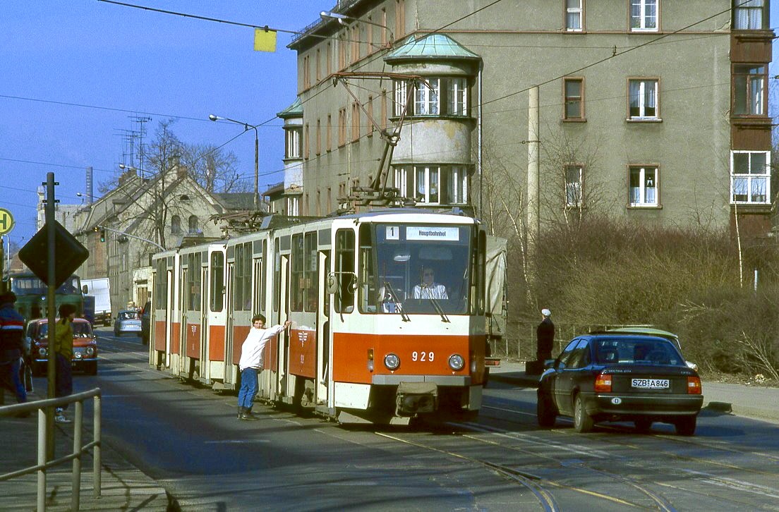 Straßenbahn Zwickau: MAN / AEG GT6M der SVZ Zwickau - Wagen 910, aufgenommen im Oktober 2015 an der Zentralhaltestelle in Zwickau.