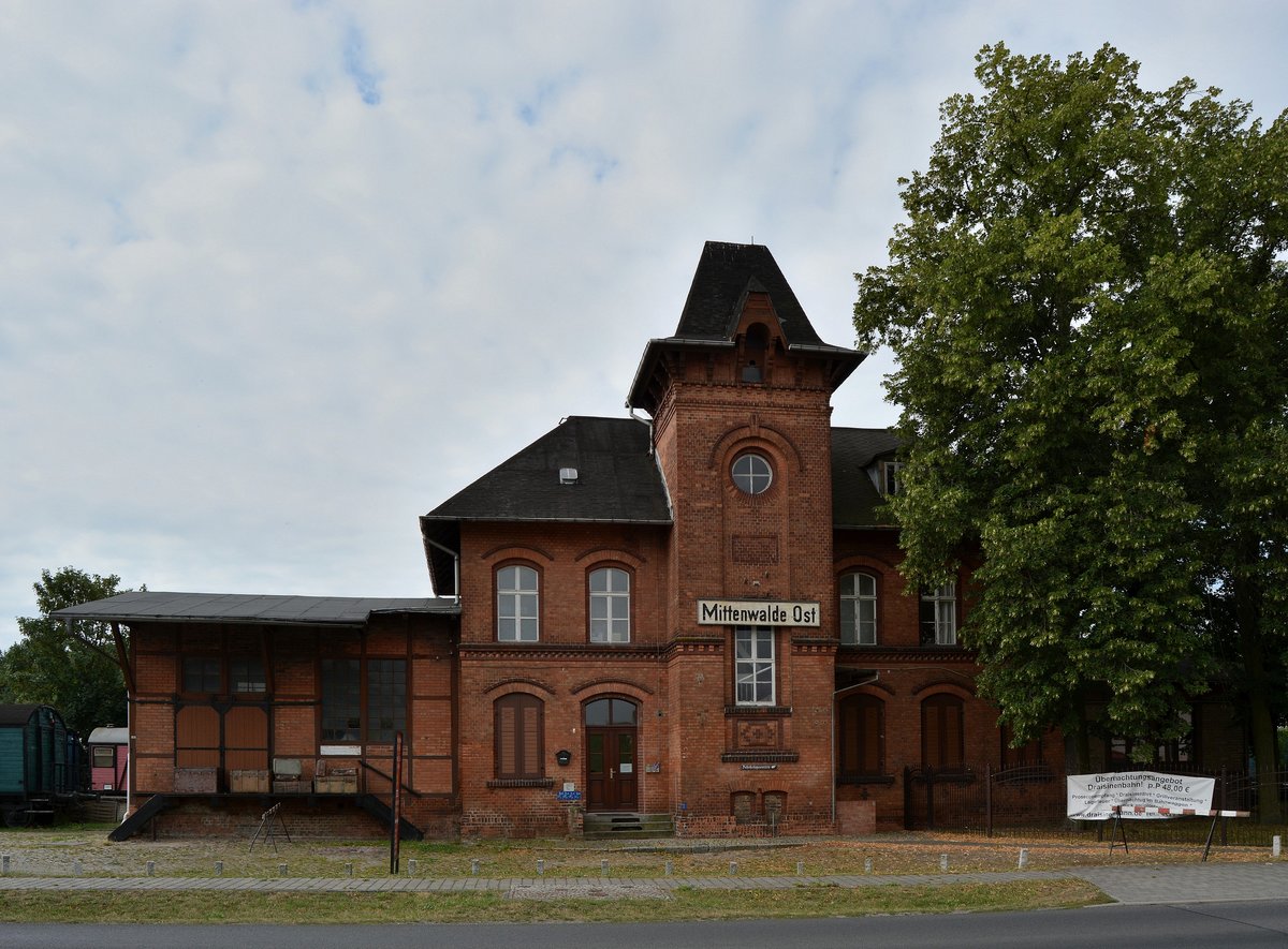 Auf den Weg durch das Umland wurde dieses Bahnhofsgebäude gesehen. Hierbei handelt es sich um den ehemaligen Bahnhof Mittenwalde Ost, nun Startpunkt einer Draisinenstrecke auf Teile der seit 1974 stillgelegten Strecke. Mittenwalde Ost am 19. Mai 2020