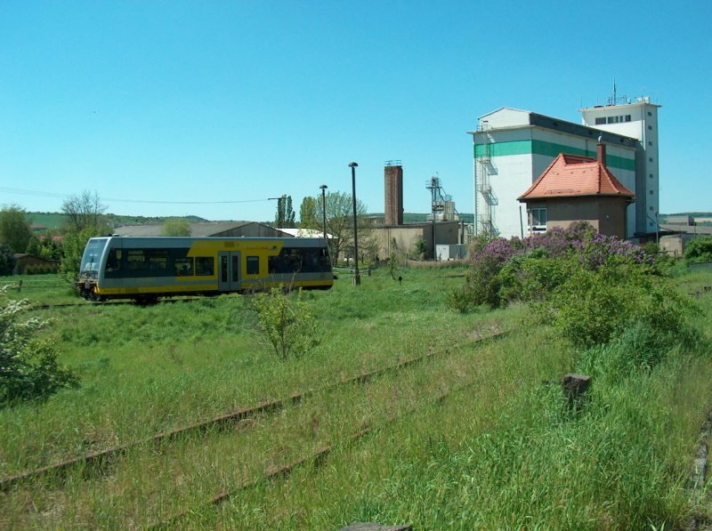 Östliche Bahnhofseinfahrt in Vitzenburg. Das Gleis auf dem der Tw der Burgenlanbahn fährt gehört zur Unstrutbahn und das zugewachsene Gleis im Vordergrund zur ehemaligen KBS 587 von Vitzenburg nach Querfurt; 10.05.2008 Frank Thomas