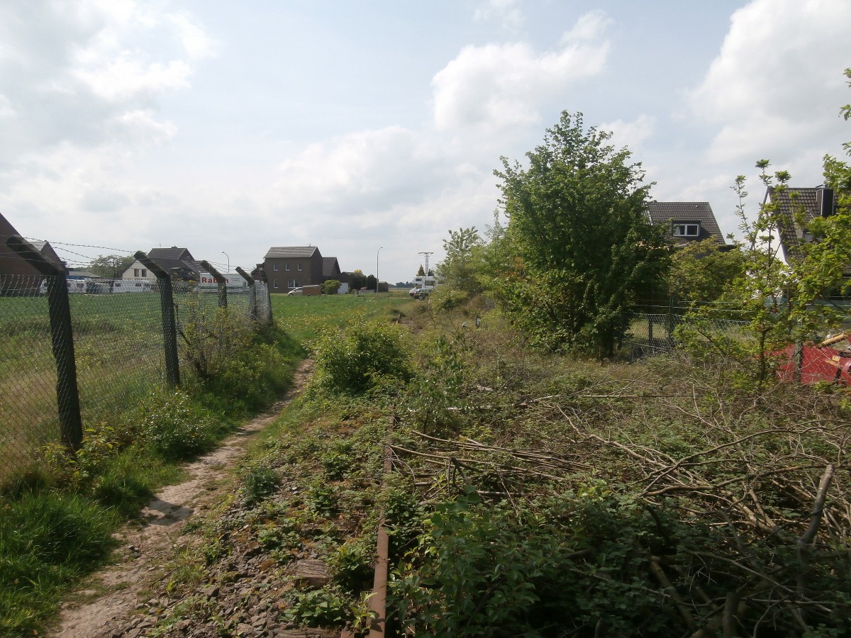 Blick in die weiten Felder wo das Gleis sogut wie garnicht bewachsen ist. Mitte der 1950er Jahre wurden gleich zwei Anschlüsse für das NATO-Hauptquartier nordöstlich von Rheindahlen neu angelegt. Dies waren die Anschlußgleise Holt I(Bild) und Holt II der britischen Rheinarmee. Das Anschlußgleis Holt II verlief bis zum östlichen Ortsausgang Rheindahlens parallel zum Eisernen Rhein. Dort zweigte diese Anschlußbahn in nördlicher Richtung ab und endete auf einem Armeegelände kurz vor der Autobahn A 61 bei Genhülsen.