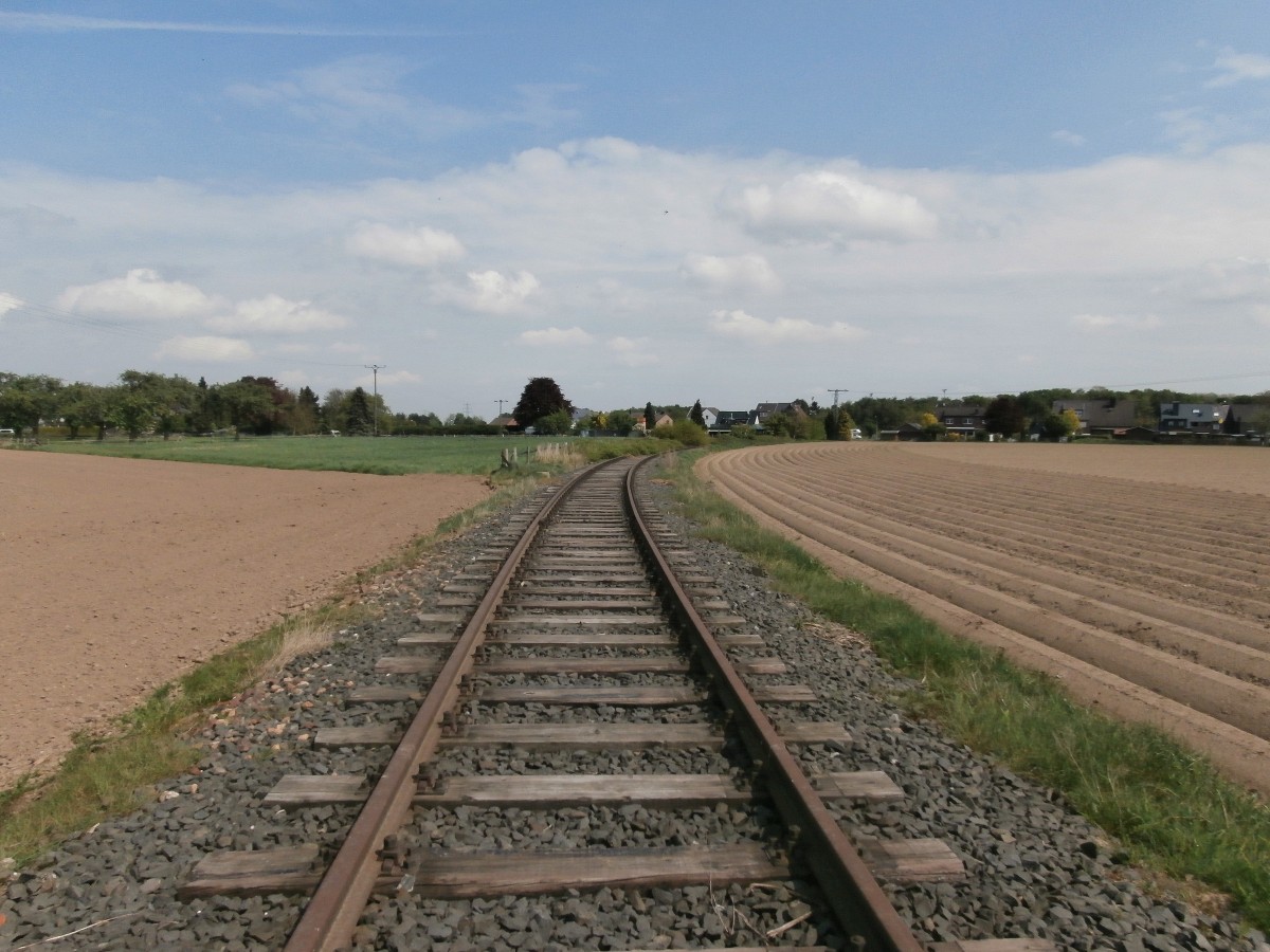 Blick in Richtung alter Stützpunkt. Mitte der 1950er Jahre wurden gleich zwei Anschlüsse für das NATO-Hauptquartier nordöstlich von Rheindahlen neu angelegt. Dies waren die Anschlußgleise Holt I(Bild) und Holt II der britischen Rheinarmee. Das Anschlußgleis Holt II verlief bis zum östlichen Ortsausgang Rheindahlens parallel zum Eisernen Rhein. Dort zweigte diese Anschlußbahn in nördlicher Richtung ab und endete auf einem Armeegelände kurz vor der Autobahn A 61 bei Genhülsen. Nahe Kothausen 26.04.2014