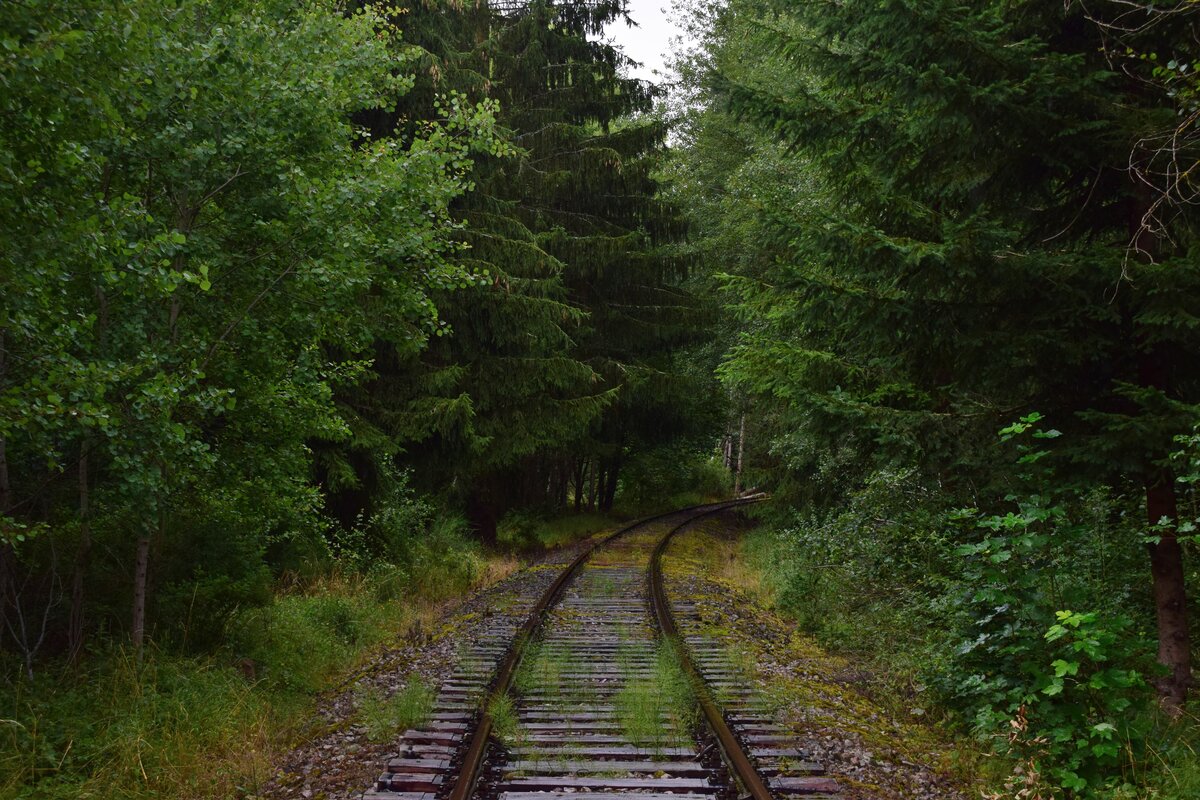 Auf durch den dunkelen Wald. Blick vom Bahnübergang L1077 in Richtung Moßbach und Triptis. Der Personenverkehr wurde am 24. Mai 1998 eingestellt und der Güterverkehr wenige Monate später Ende 1998. Seit dem 1.1.2005 ist die Strecke offiziell stillgelegt.