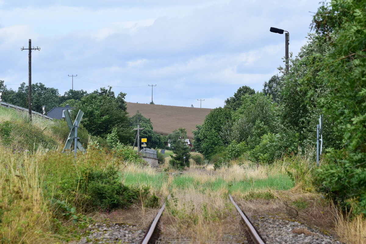 Blick in den Bahnhof Knau von Ziegenrück kommend. Auf der Strecke zwischen Triptis und Unterlemnitz gab es viele Bahnhöfe welche keine Ausfahrsignale haben ebenso wie Knau. Zur Einstellung des Verkehrs war Knau nur noch Kreuzungsbahnhof. Der Personenverkehr wurde am 24. Mai 1998 eingestellt und der Güterverkehr wenige Monate später Ende 1998. Seit dem 1.1.2005 ist die Strecke offiziell stillgelegt.