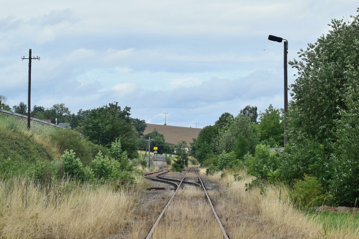 Blick in den Bahnhof Knau von Ziegenrück kommend. Auf der Strecke zwischen Triptis und Unterlemnitz gab es viele Bahnhöfe welche keine Ausfahrsignale haben ebenso wie Knau. Zur Einstellung des Verkehrs war Knau nur noch Kreuzungsbahnhof. Der Personenverkehr wurde am 24. Mai 1998 eingestellt und der Güterverkehr wenige Monate später Ende 1998. Seit dem 1.1.2005 ist die Strecke offiziell stillgelegt.