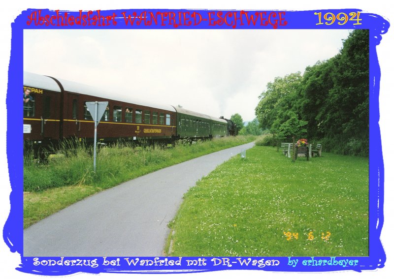 Abschiedsfahrt nach Eschwege, Zug hier kurz hinter Wanfried, im Zug auch ein DR-Mitropa-Speisewagen