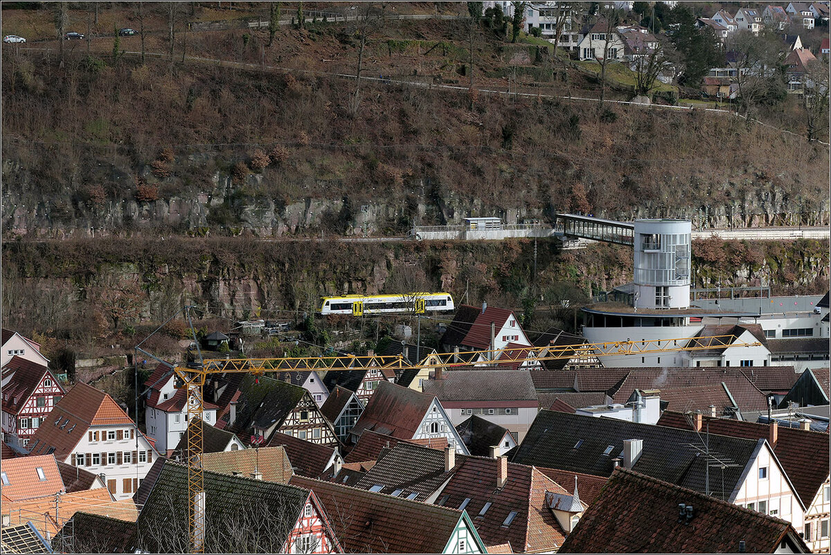Ausblick vom Steg zur Hermann-Hesse-Bahn in Calw hinunter zum Haltepunkt der Kulturbahn, hier mit einem Regioshuttle in den Landesfarben von Baden-Württemberg. Ursprünglich sollte die Hermann-Hesse-Bahn ebenfalls mit Regioshuttles betrieben werden. Diese werden aber nicht mehr hergestellt.